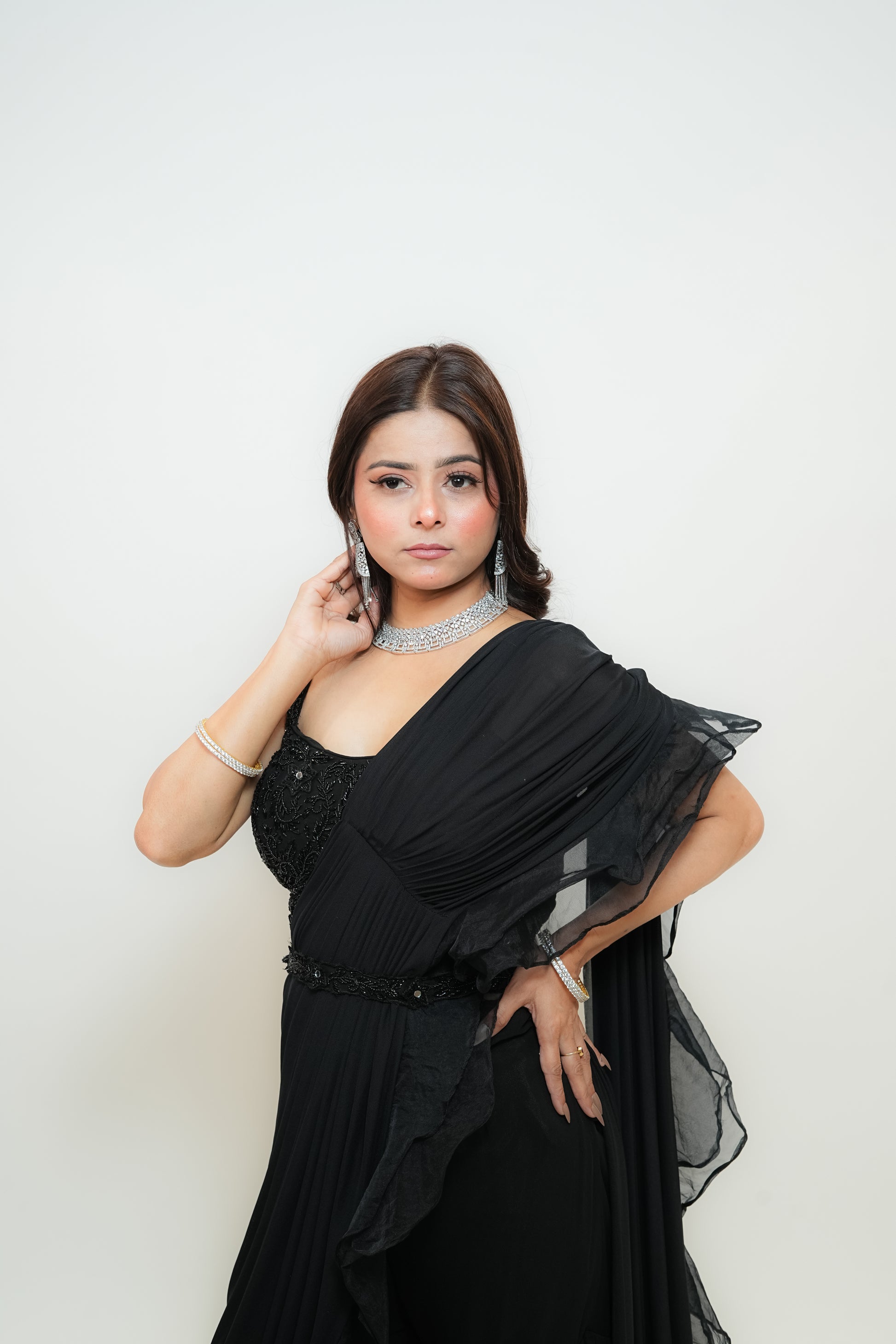 This is a drape sharara saree. The sharara is made of georgette, while the drape is crafted from lycra and finished with an organza frill for added flair. The blouse is made of georgette and features intricate work including cutdana, pearls, and mirrors. A separate belt is included, embellished with mirror, cutdana, and pearl work to complement the look.