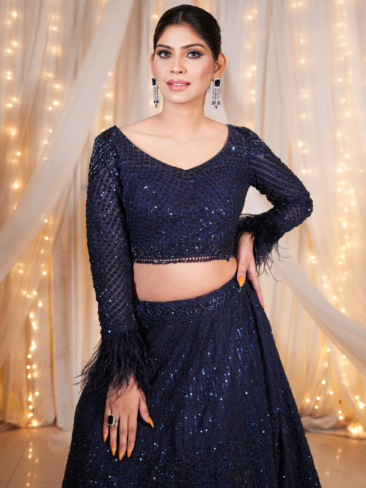 A dreamy blue lehenga adorned with intricate hand embellishments, paired with a blouse featuring delicate fur detailing at the sleeve ends. This statement ensemble blends luxury with playful elegance — perfect for winter weddings and glamorous evenings.