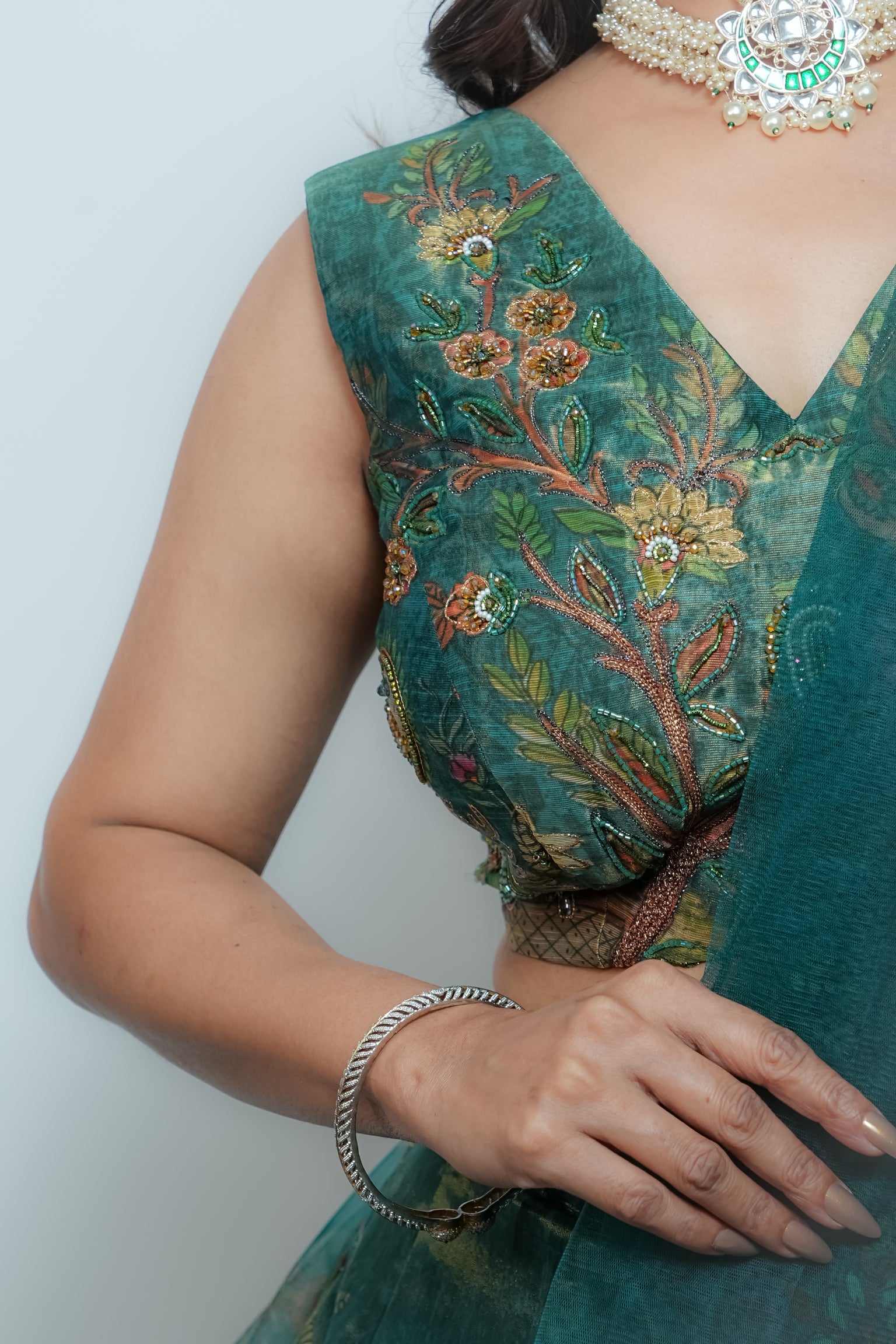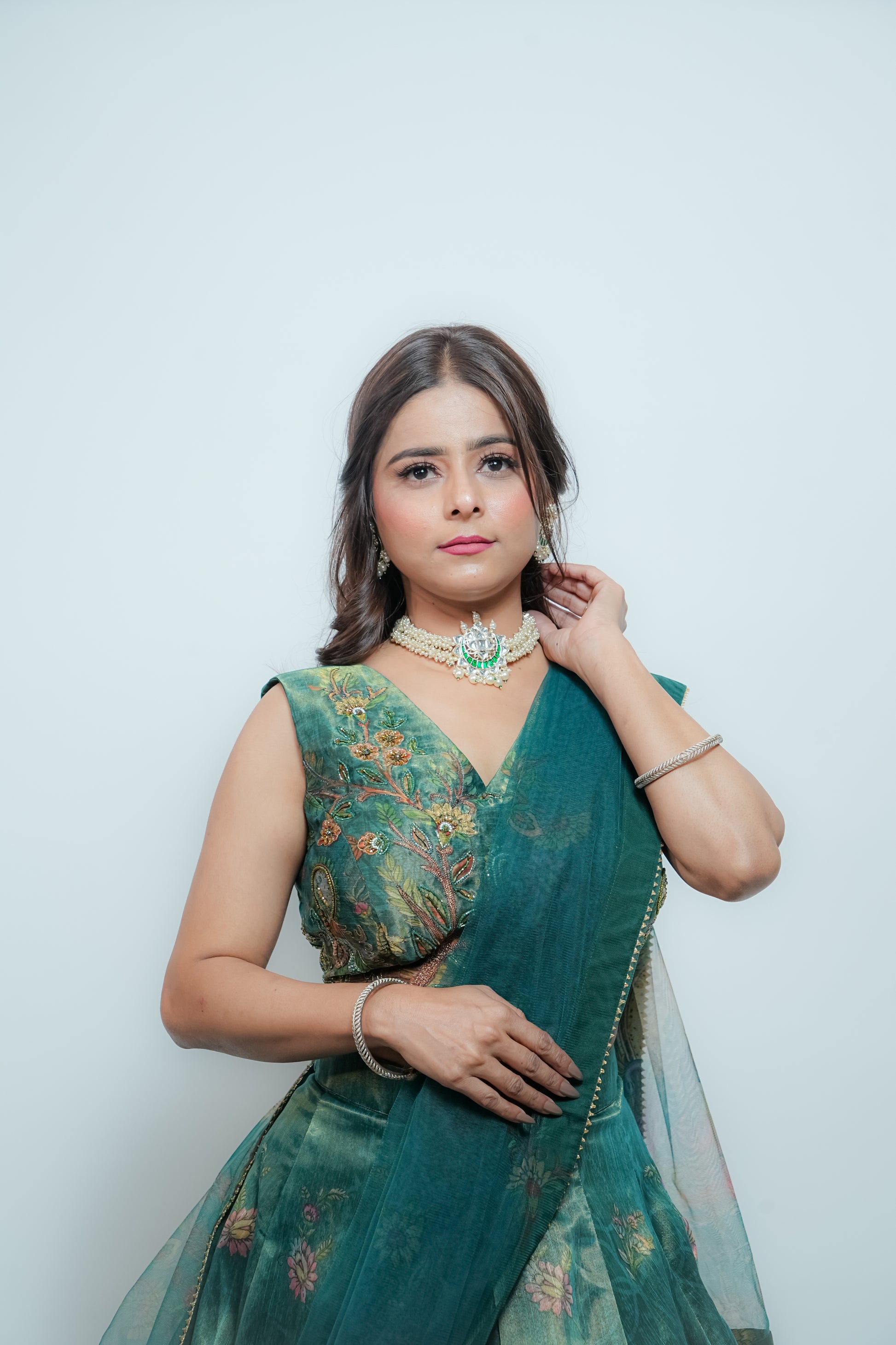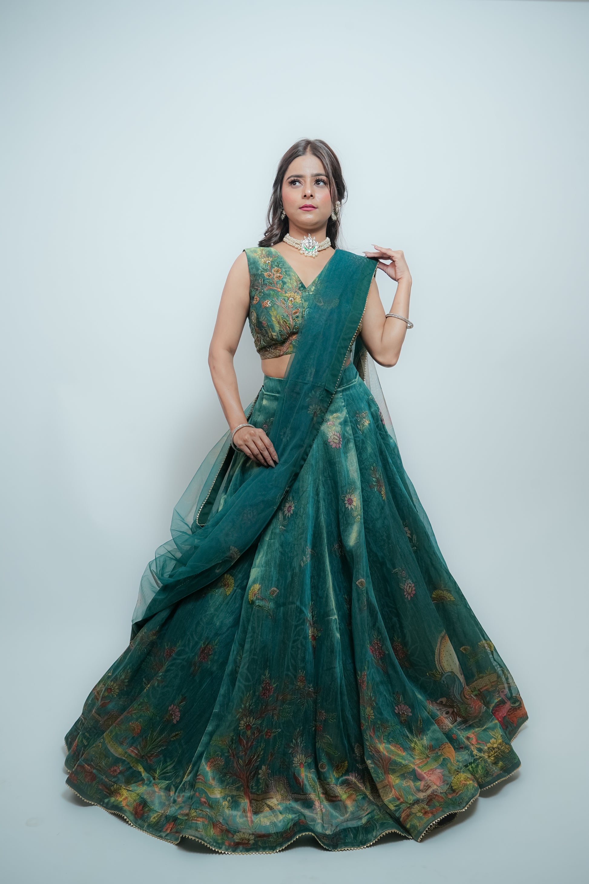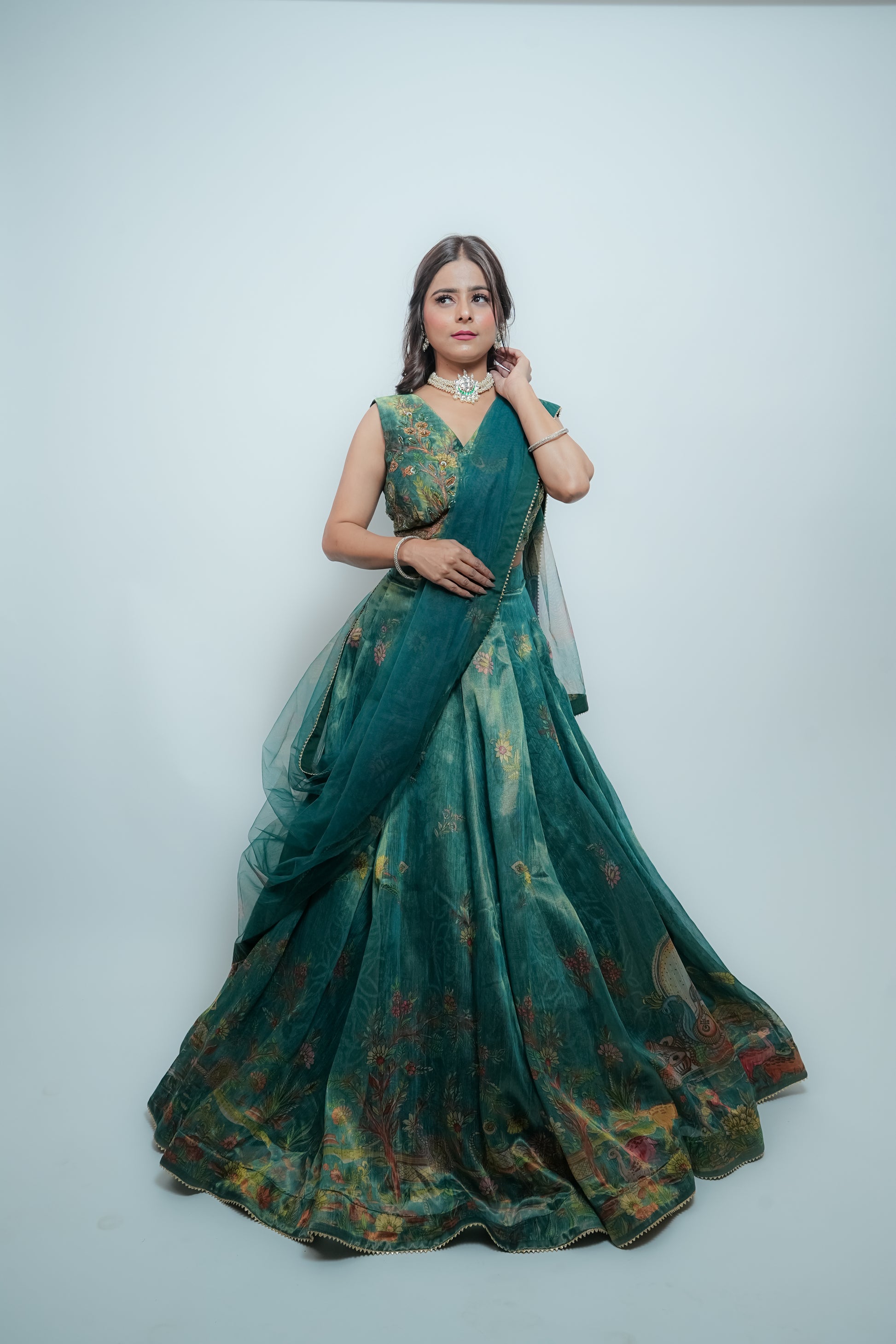 The skirt is made of shimmer tissue, fully digitally printed in multicolor, with gota detailing at the bottom. The blouse is also made of shimmer tissue, featuring zari, zardozi, cut dana, pearls, and sequin work. The dupatta is made of net, fully digitally printed, with subtle gota lining along all borders.