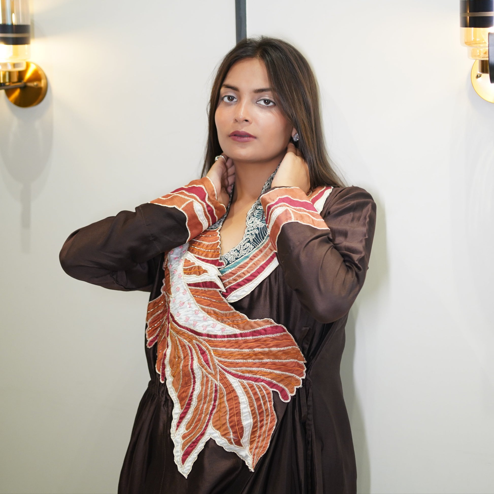 Rooted in tradition, refined for today — Chand-Mitti is a rich brown silk dress adorned with delicately hand-embellished leaf motifs. Designed in an elegant Anghrakha pattern with soft side gathers, it’s a graceful nod to nature and nostalgia.