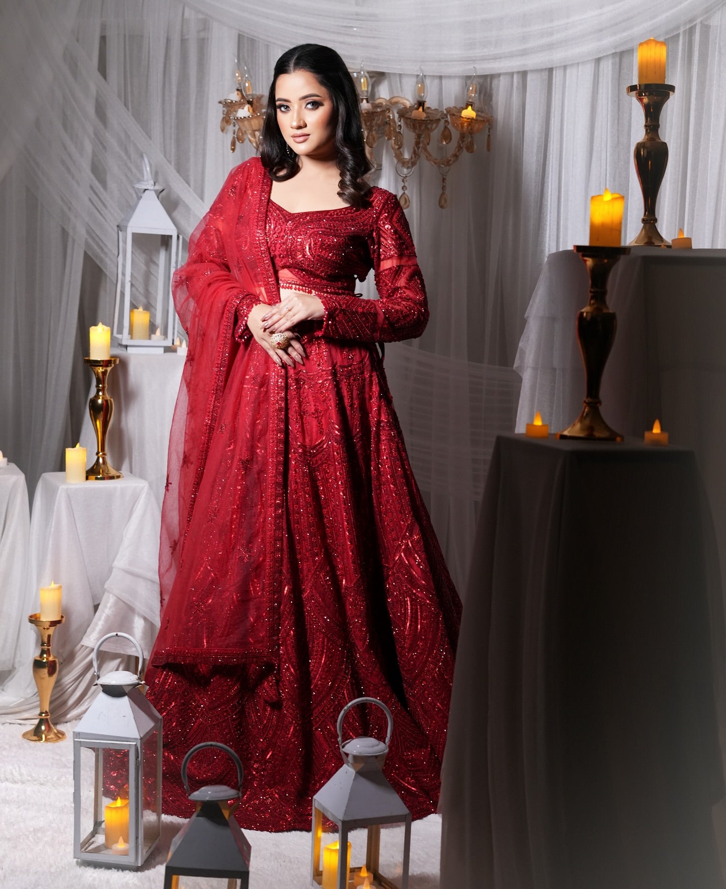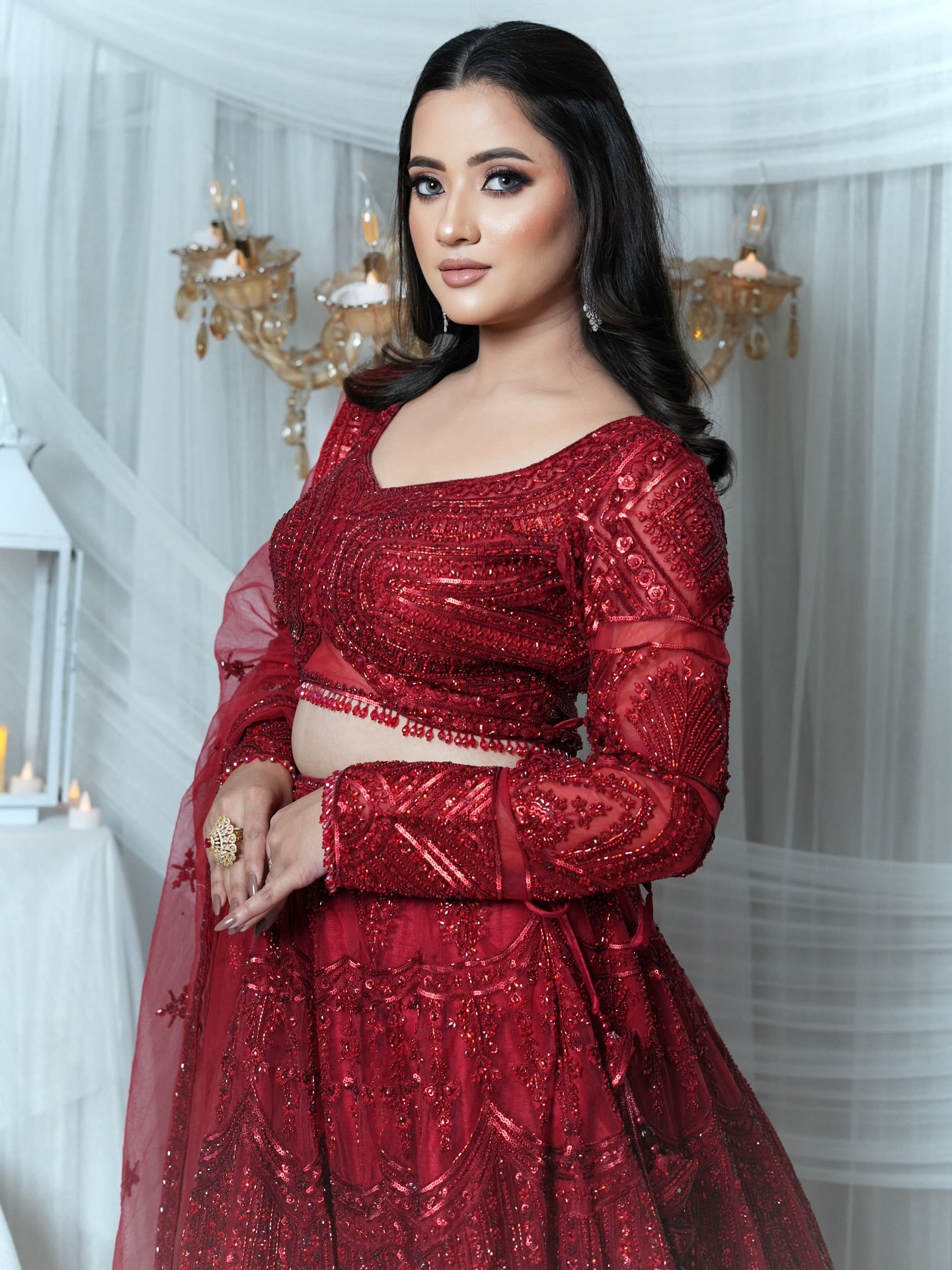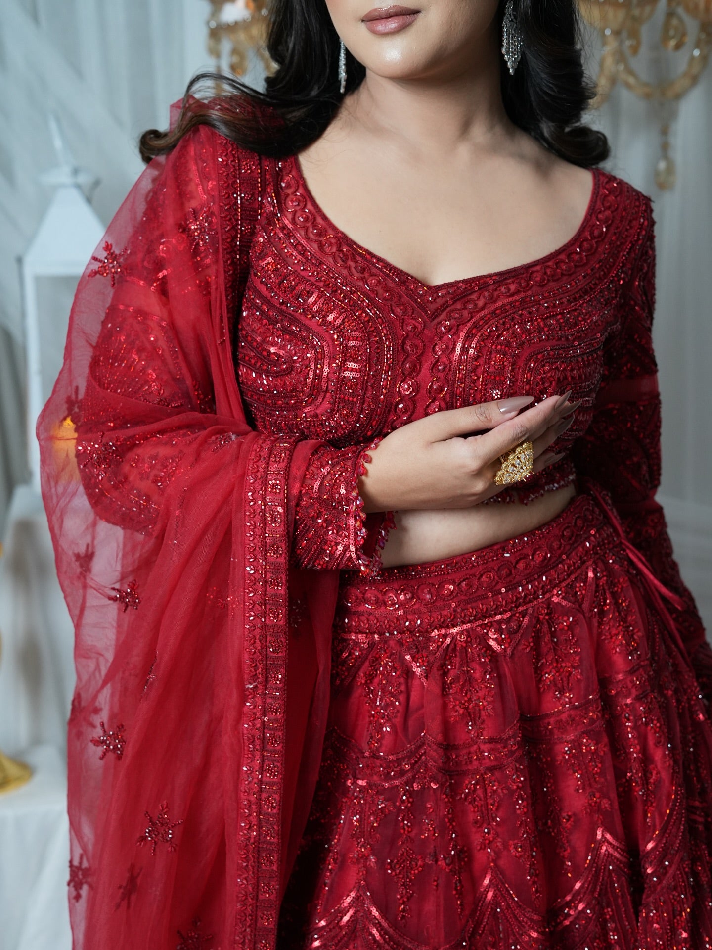 A vision in crimson red, this exquisite lehenga is crafted on delicate net and adorned with intricate hand embroidery. Every detail speaks of timeless elegance and craftsmanship, making it a perfect pick for your most special celebrations.