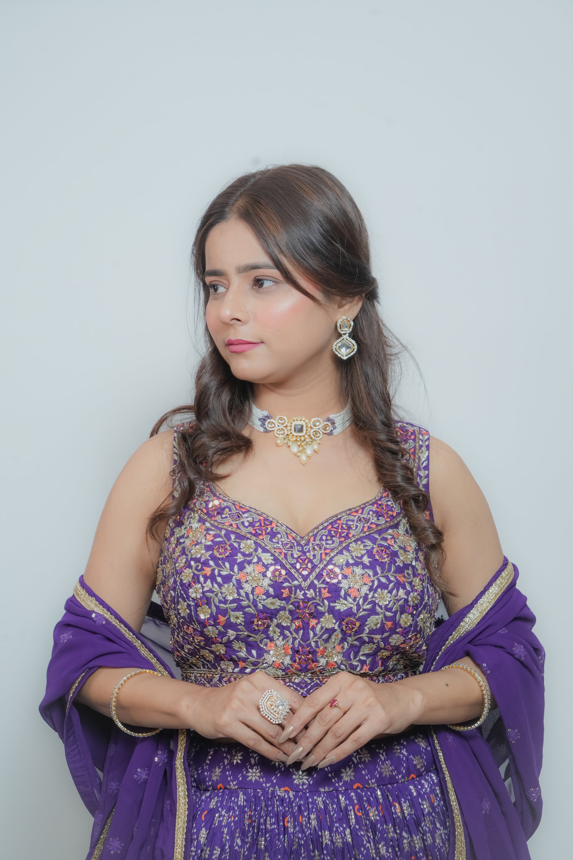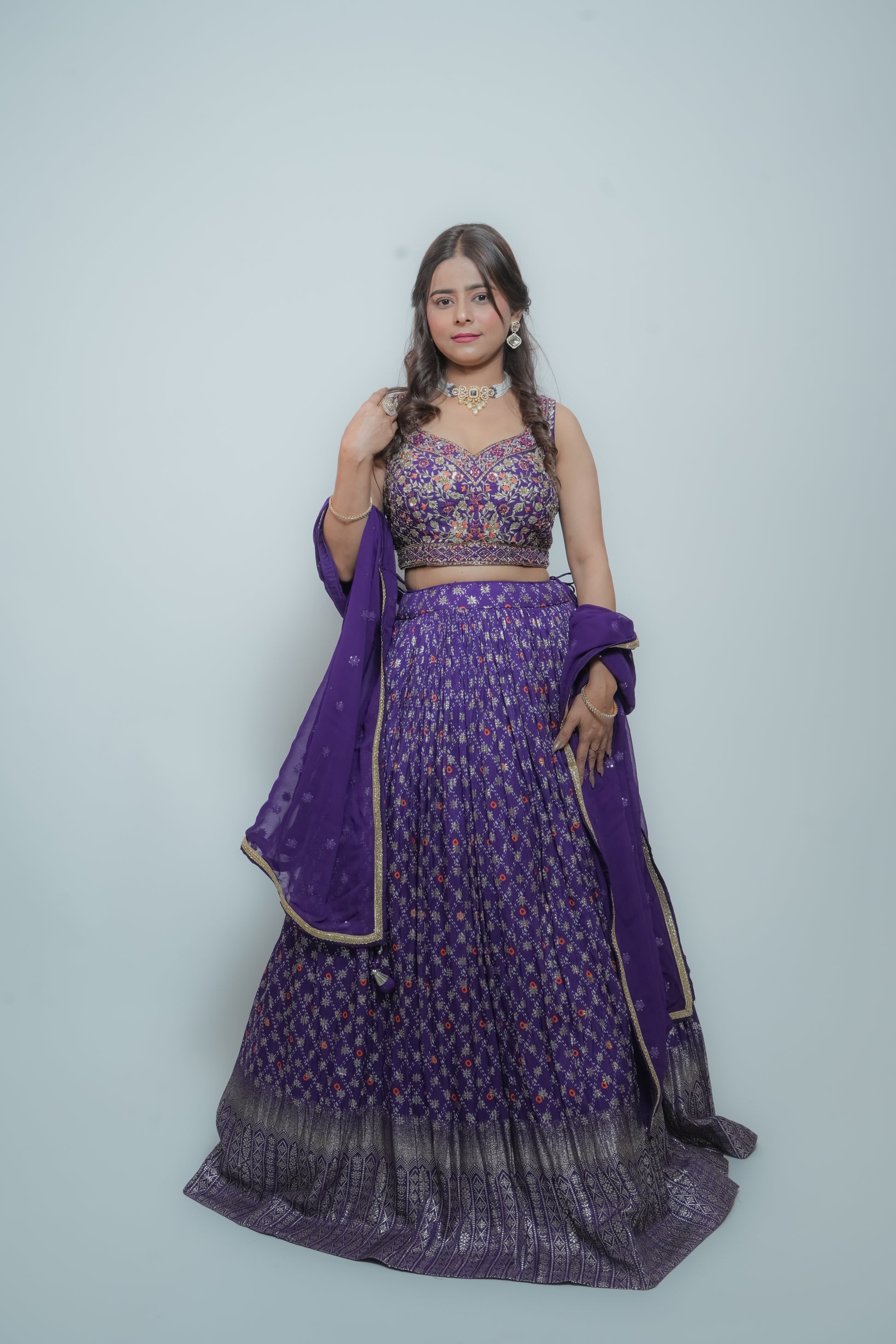 The skirt is made of printed georgette with zari work. The blouse is crafted from raw silk and features detailed embroidery with mirrors, silk thread, stones, cutdana, sequins, and zardozi. The dupatta is georgette with sequin and thread embroidery, and all borders are highlighted with gota. This set includes a separate belt embellished with cutdana, stones, silk thread, mirrors, and zardozi work.