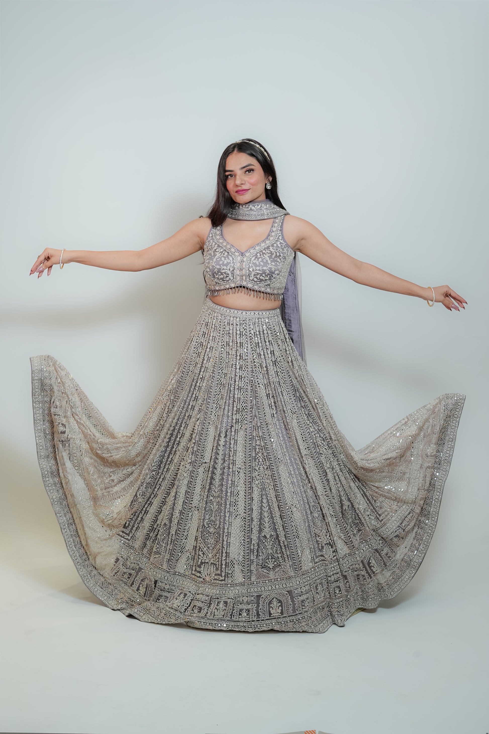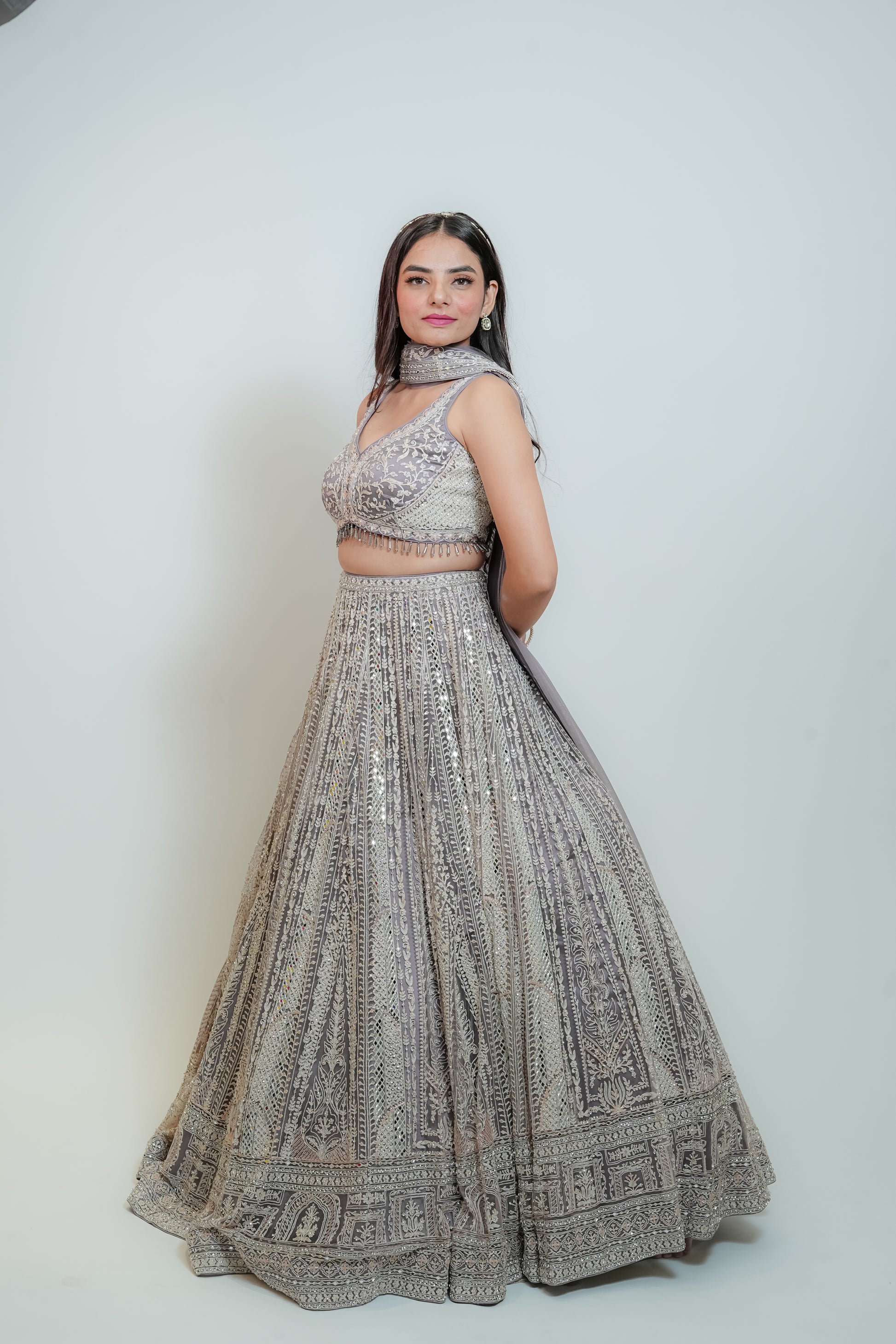 The lehenga is made of net and features work in silk, mirrors, stones, sequins, and cut dana. The blouse is also made of net, embellished with silk, stones, sequins, and cut dana work, and includes crystal hangings at the waist. The dupatta is made of net and is adorned on all four borders with work in silk, sequins, cut dana, stones, and mirrors.