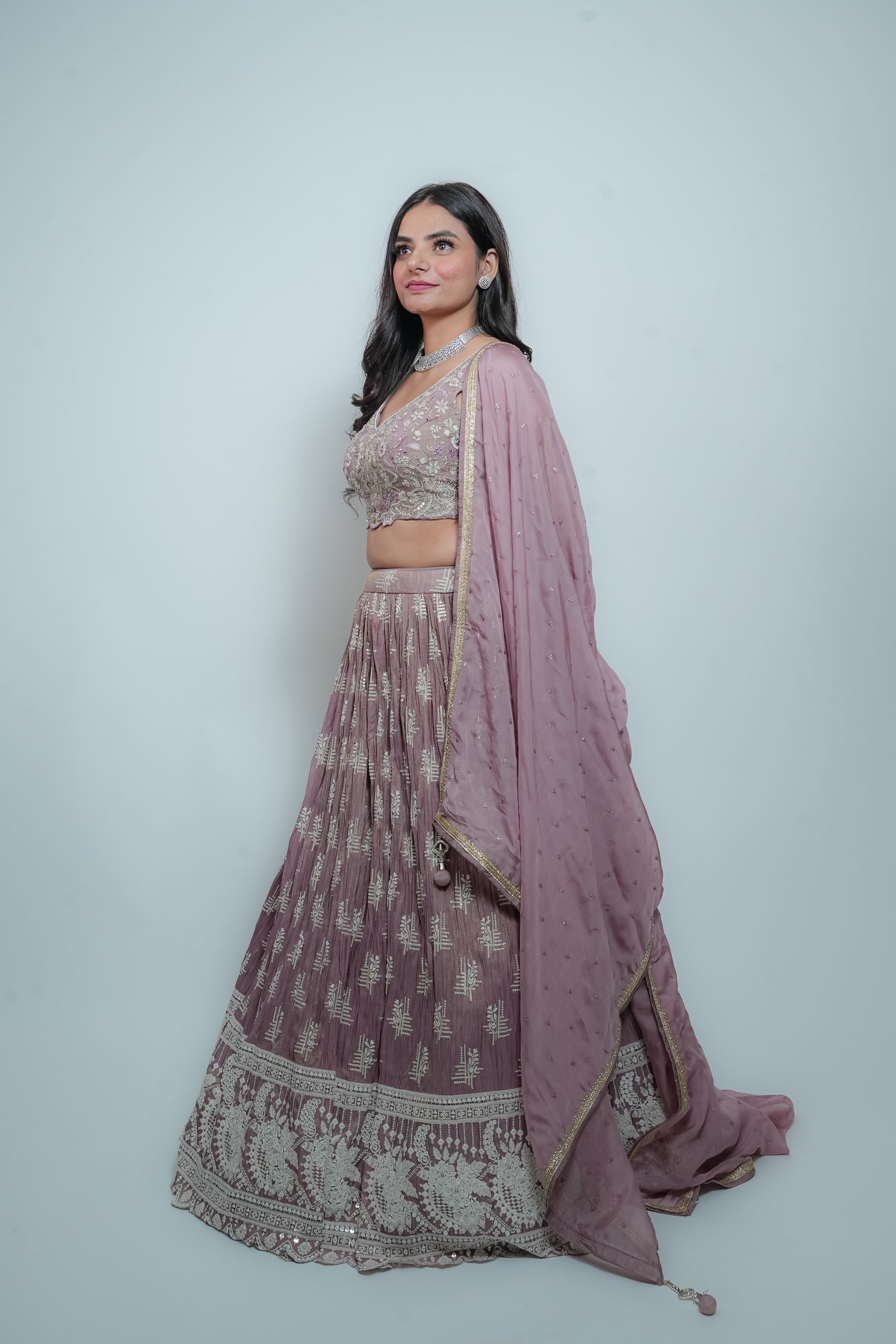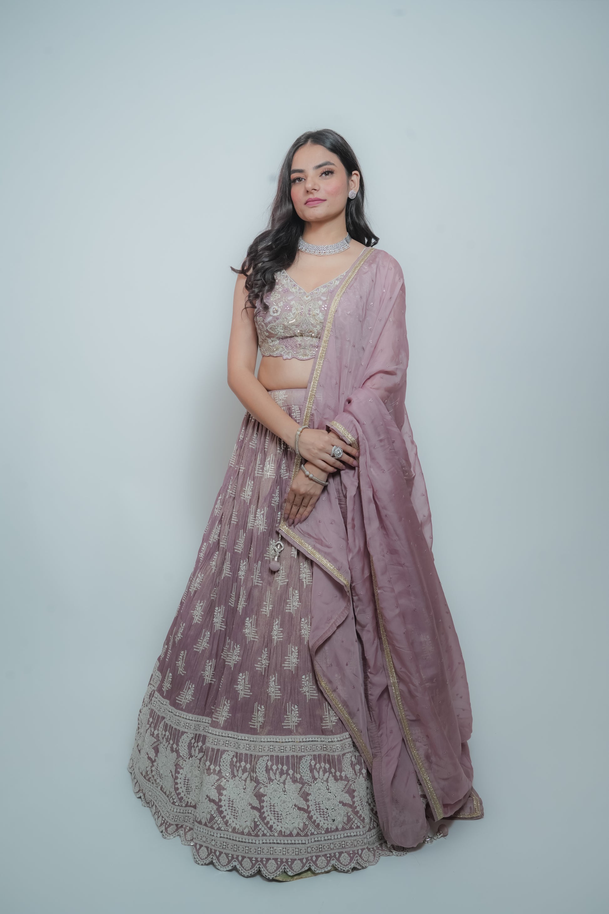 The skirt is made of crushed tissue fabric with sequin and thread work. The blouse is made of tissue and features intricate embroidery with mirrors, silk thread, zardozi, cutdana, sequins, and pearls. The dupatta is made of organza with sequin and thread embroidery, and all four borders are highlighted with gota.