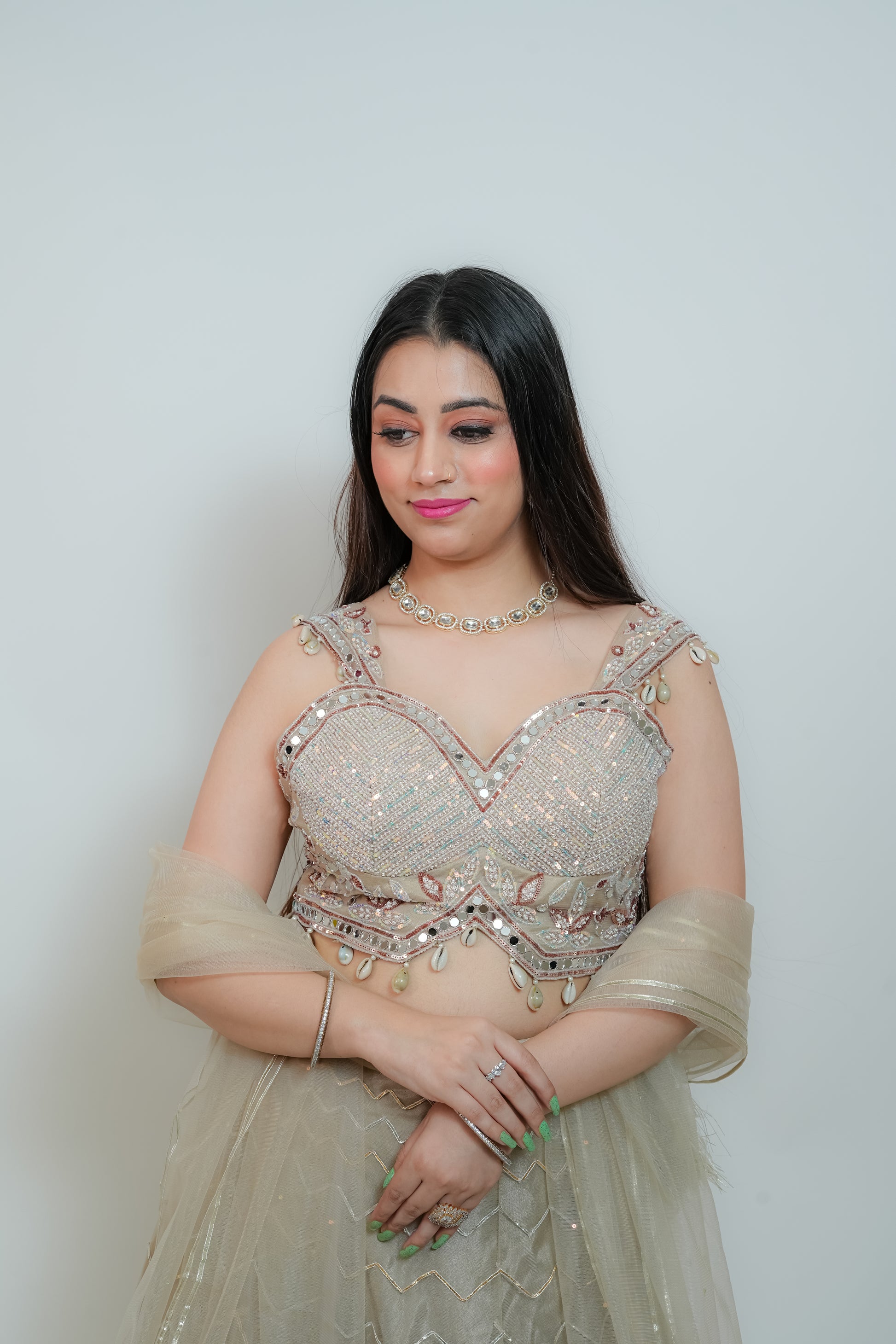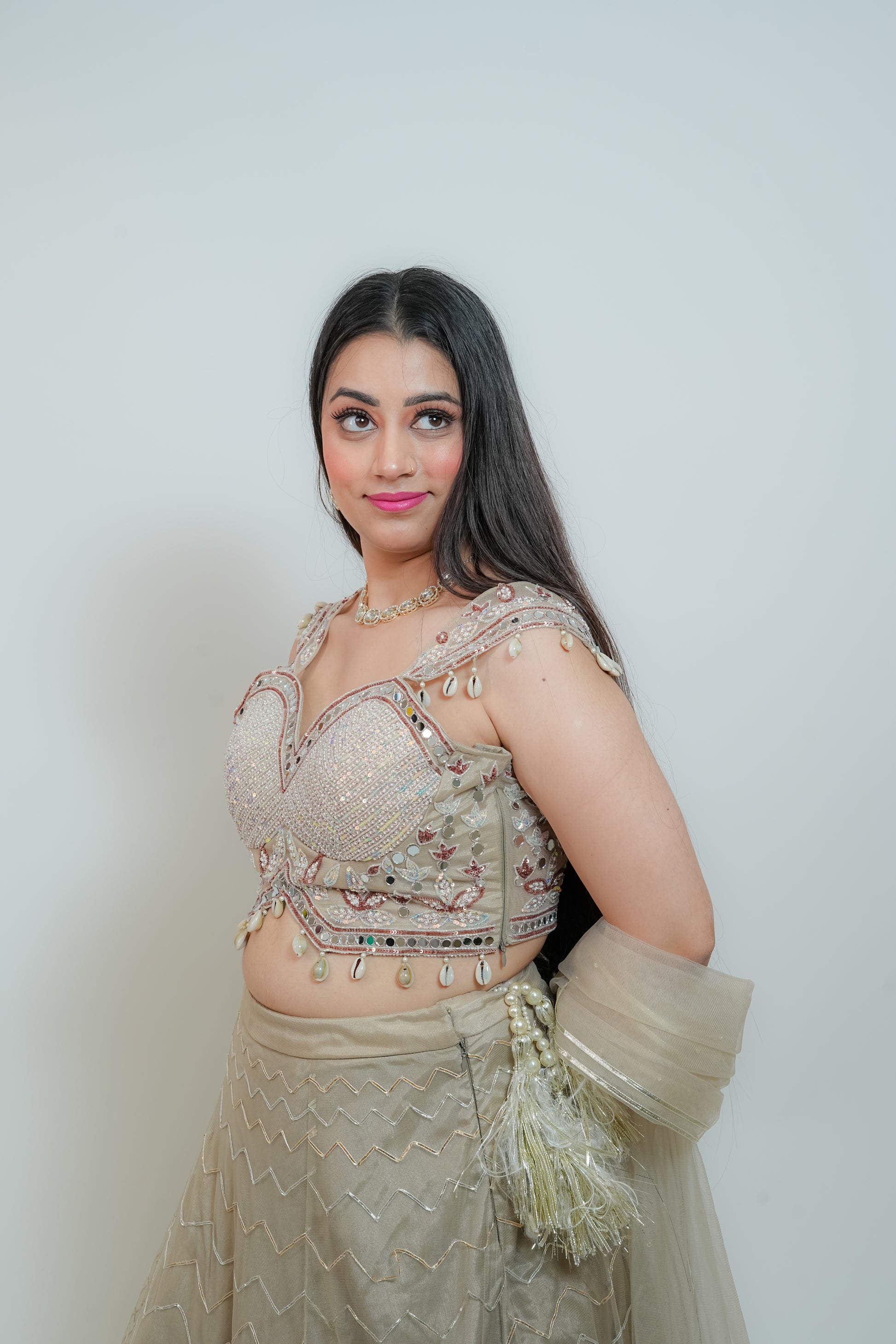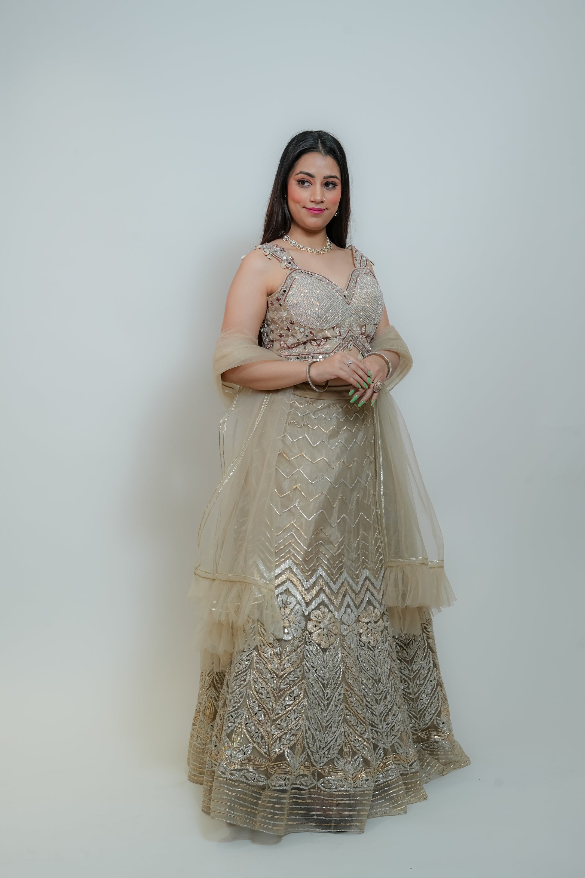 The skirt is made of net fabric and adorned with intricate golden and silver gota work, mirror detailing, and resham embroidery. The blouse is also net-based, featuring multicolored sequin work, pearl embellishments, and zardozi with mirror accents. Both the waist and half sleeves are enhanced with hanging pearls and seashells. The outfit is completed with a net dupatta finished with gota work and a net frill border. The entire ensemble comes in a metallic tone.