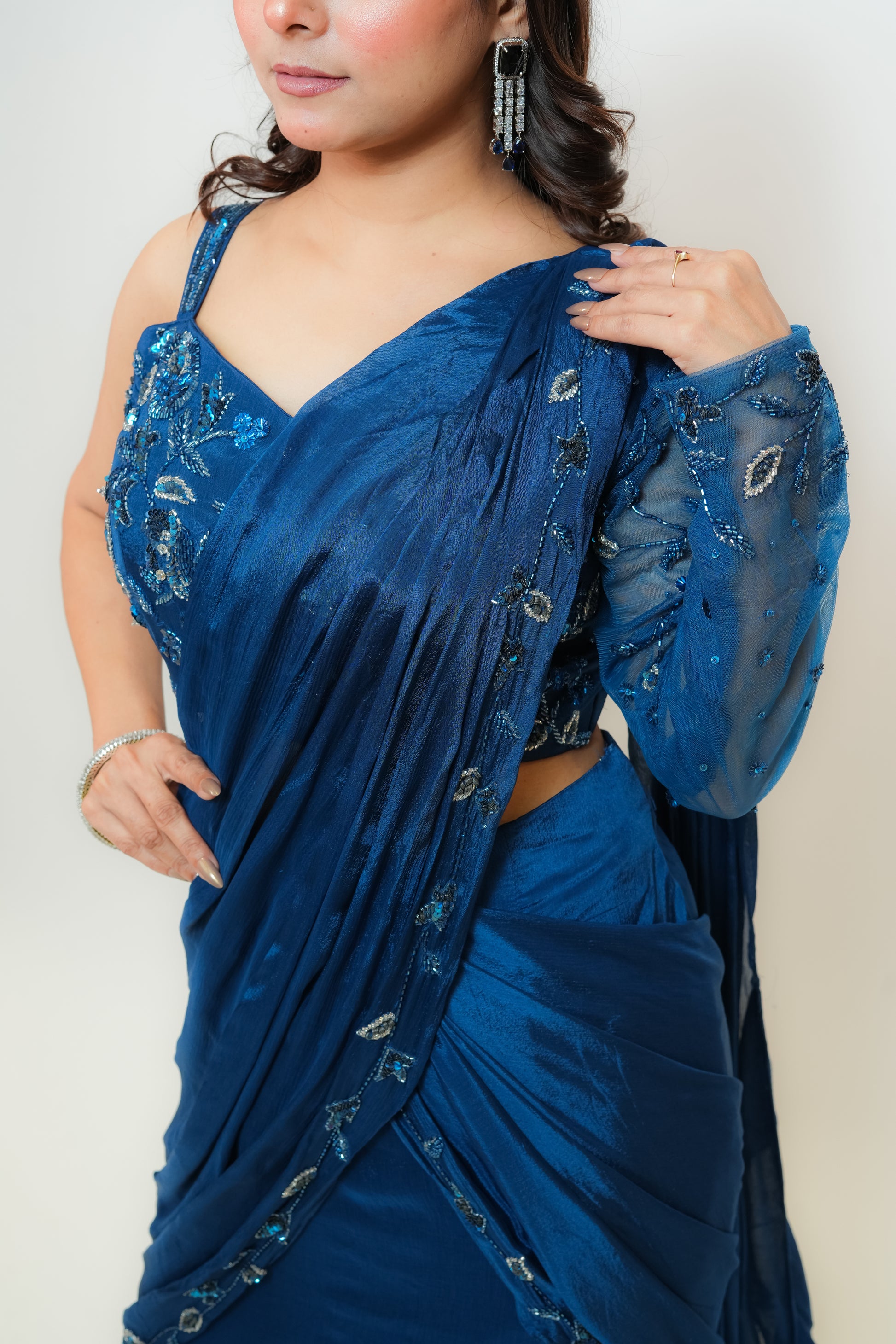 This is a drape saree made from Chinon fabric. The borders of the drape are embellished with cutdana and sequins. The blouse is a one-sided sleeve design crafted from Chinon and net, featuring intricate embroidery with sequins, cutdana, pearls, and stones for an elegant and contemporary look.