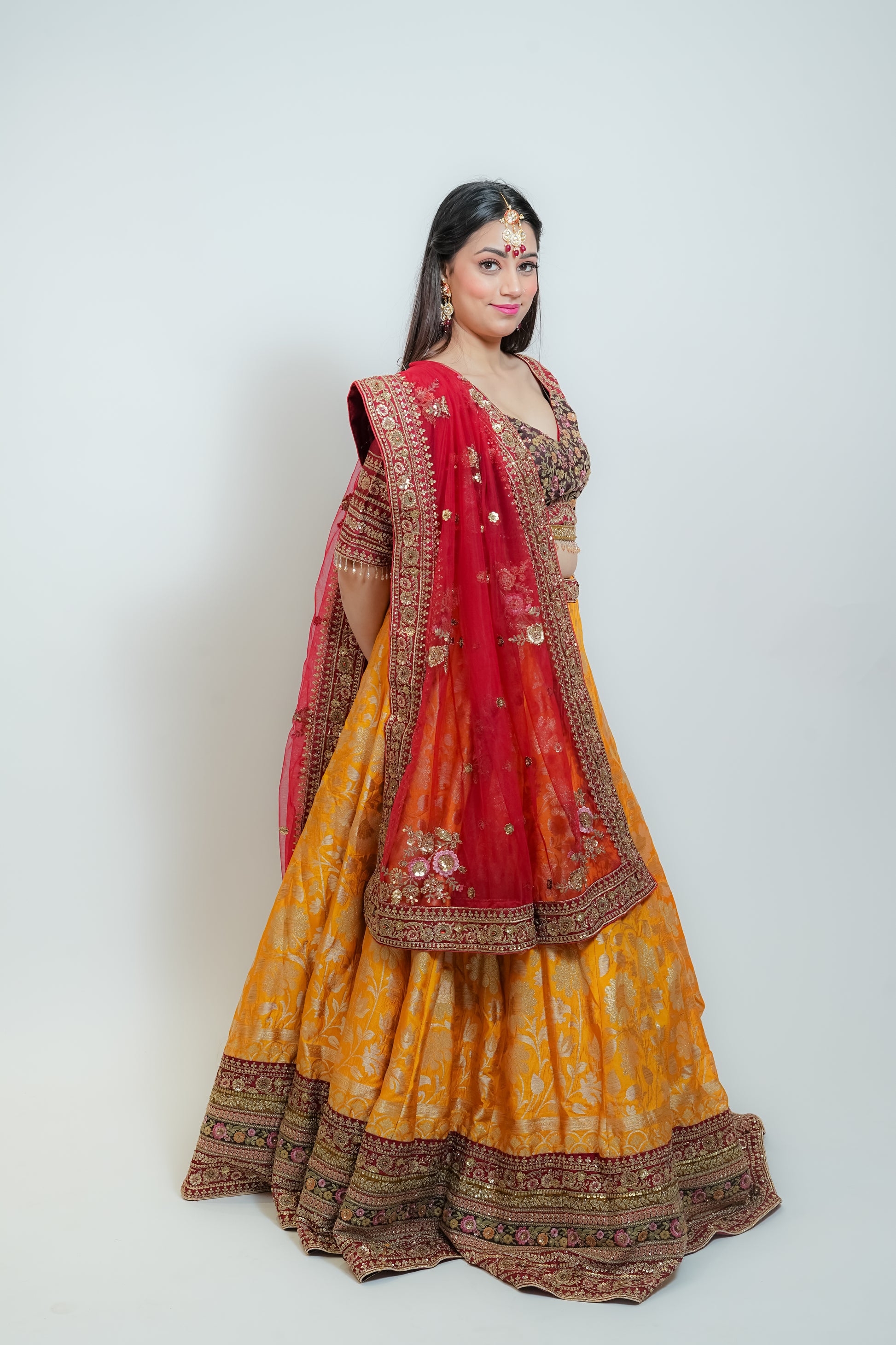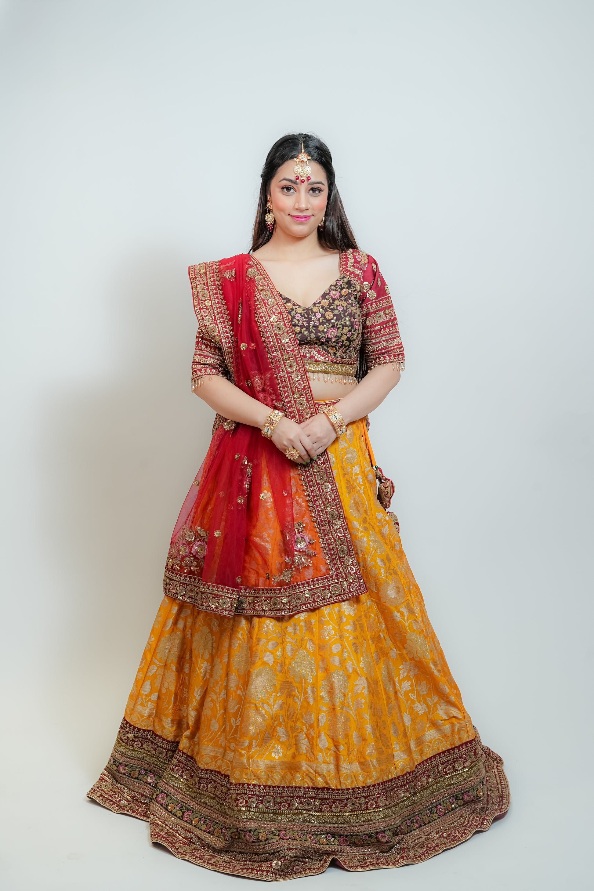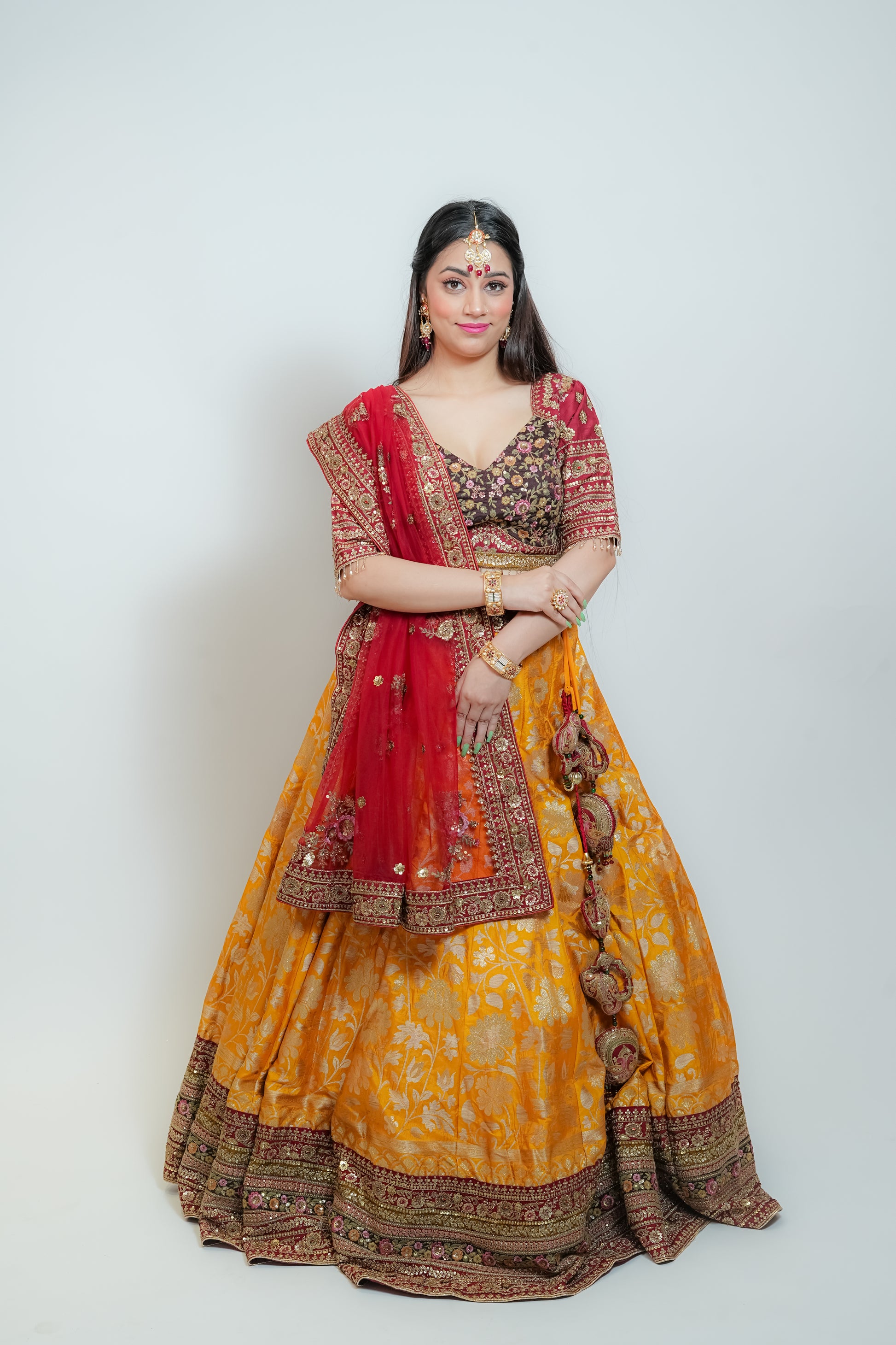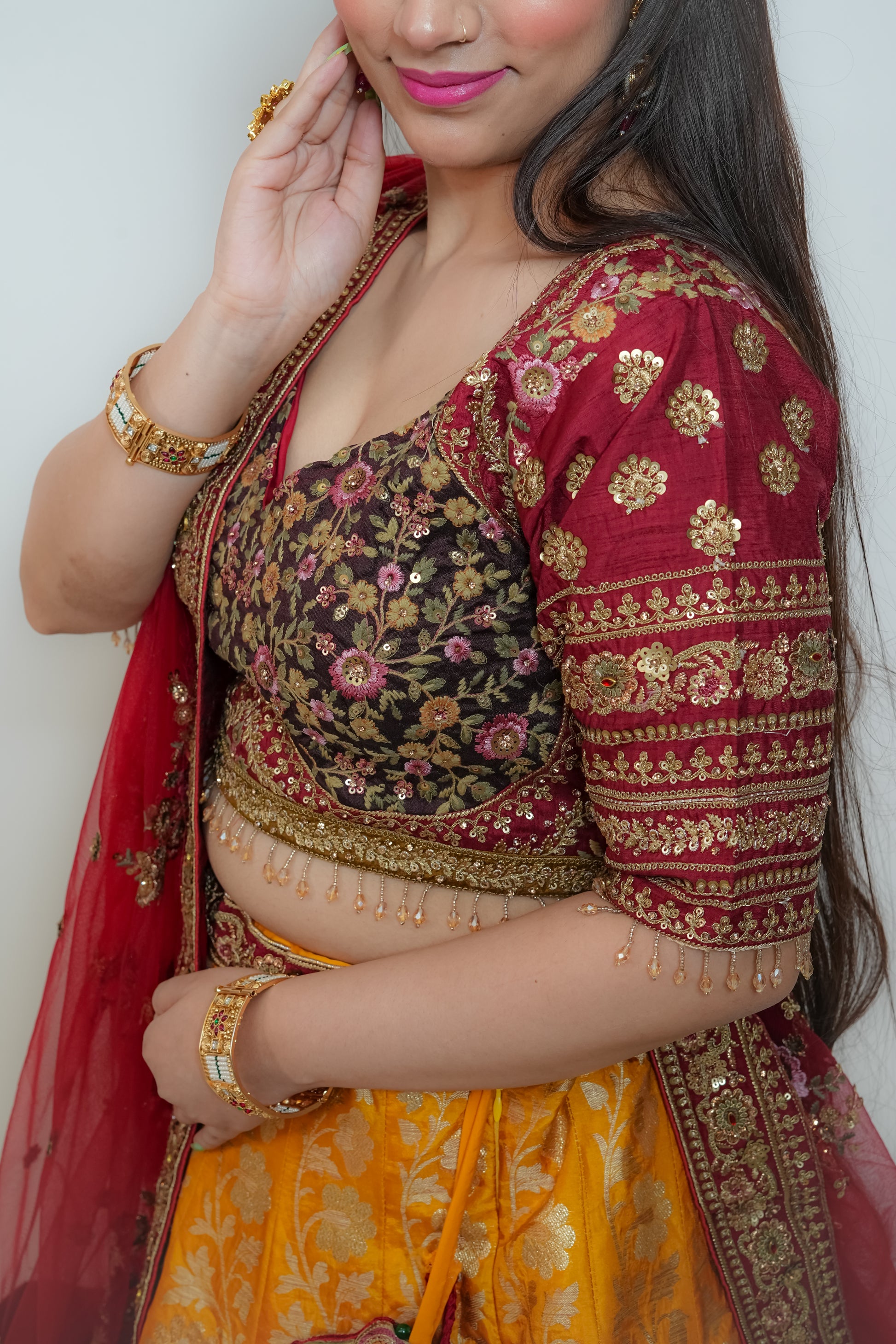 The lehenga is made of raw silk and features full zari work. The border at the bottom is adorned with work in silk, sequins, and stones. The blouse is made of raw silk and includes zari, silk, sequins, and stone work, with crystal work, with crystal hangings at the waist. The dupatta is made of net and is handcrafted with sequins, zari, silk, and stone work.