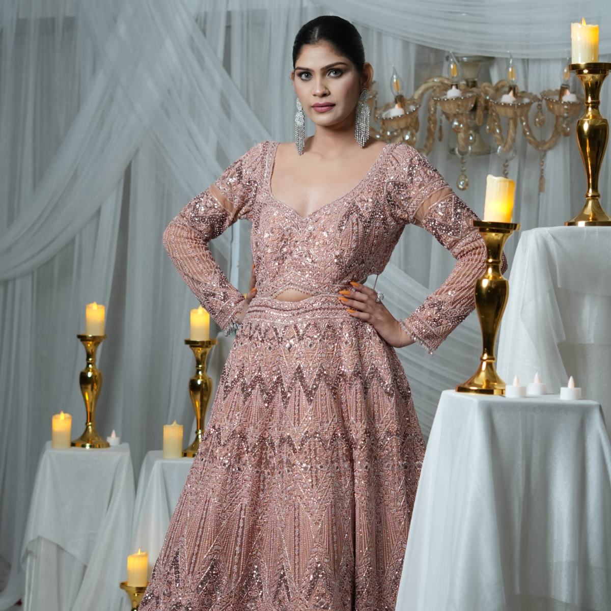 This full-sleeved peach gown is delicately hand-embroidered from top to hem, featuring a beautifully sculpted neckline that flatters every frame. A refined choice for those who adore understated luxury.