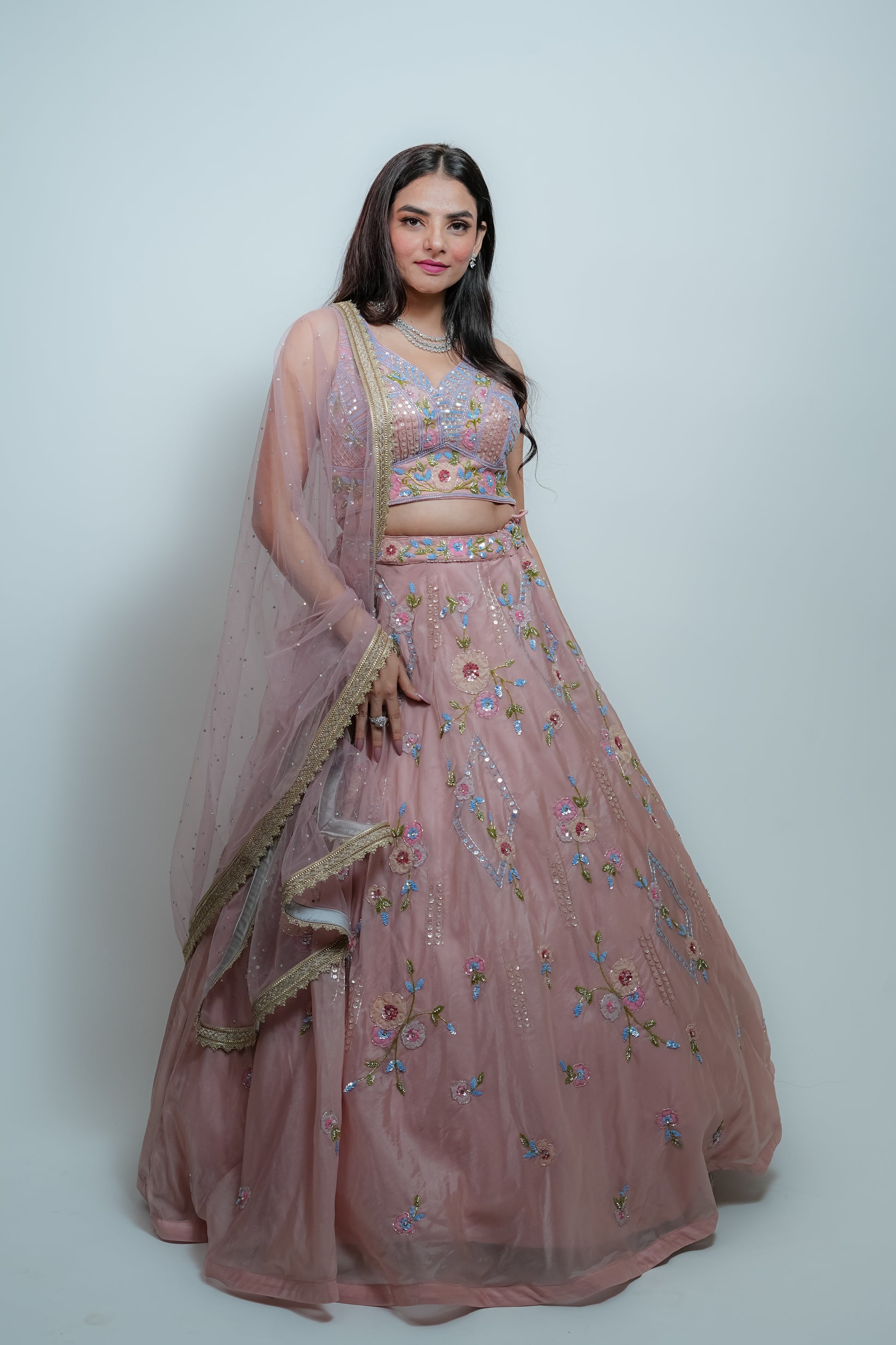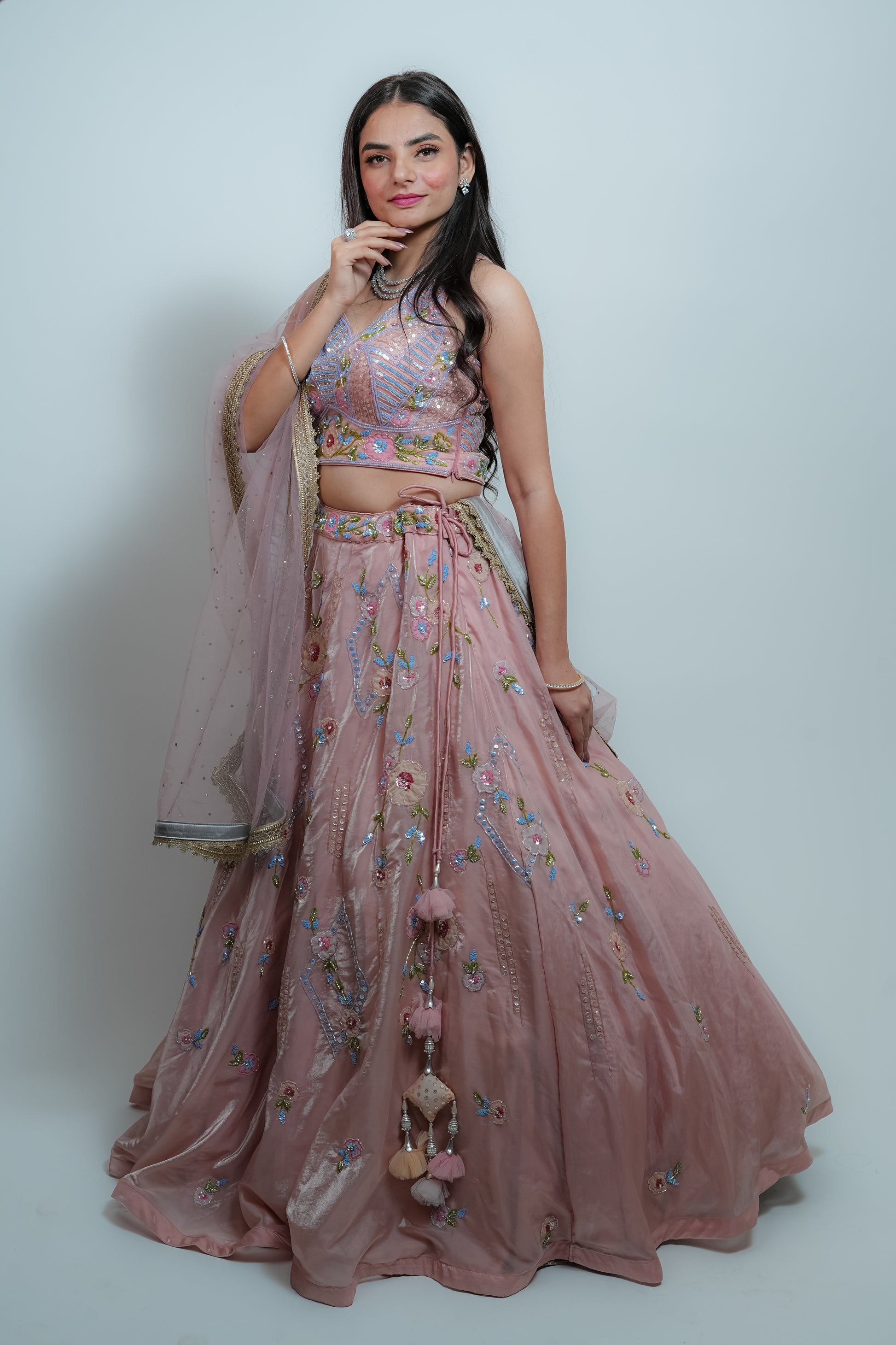 The skirt is made of shimmer organza and features detailed patchwork along with cut dana, sequins, and stone embellishments. The blouse is made of organza and is similarly adorned with cut dana, sequins, and stone work. The dupatta is made of net with an all-over stone jaal design and gota borders on all four sides.