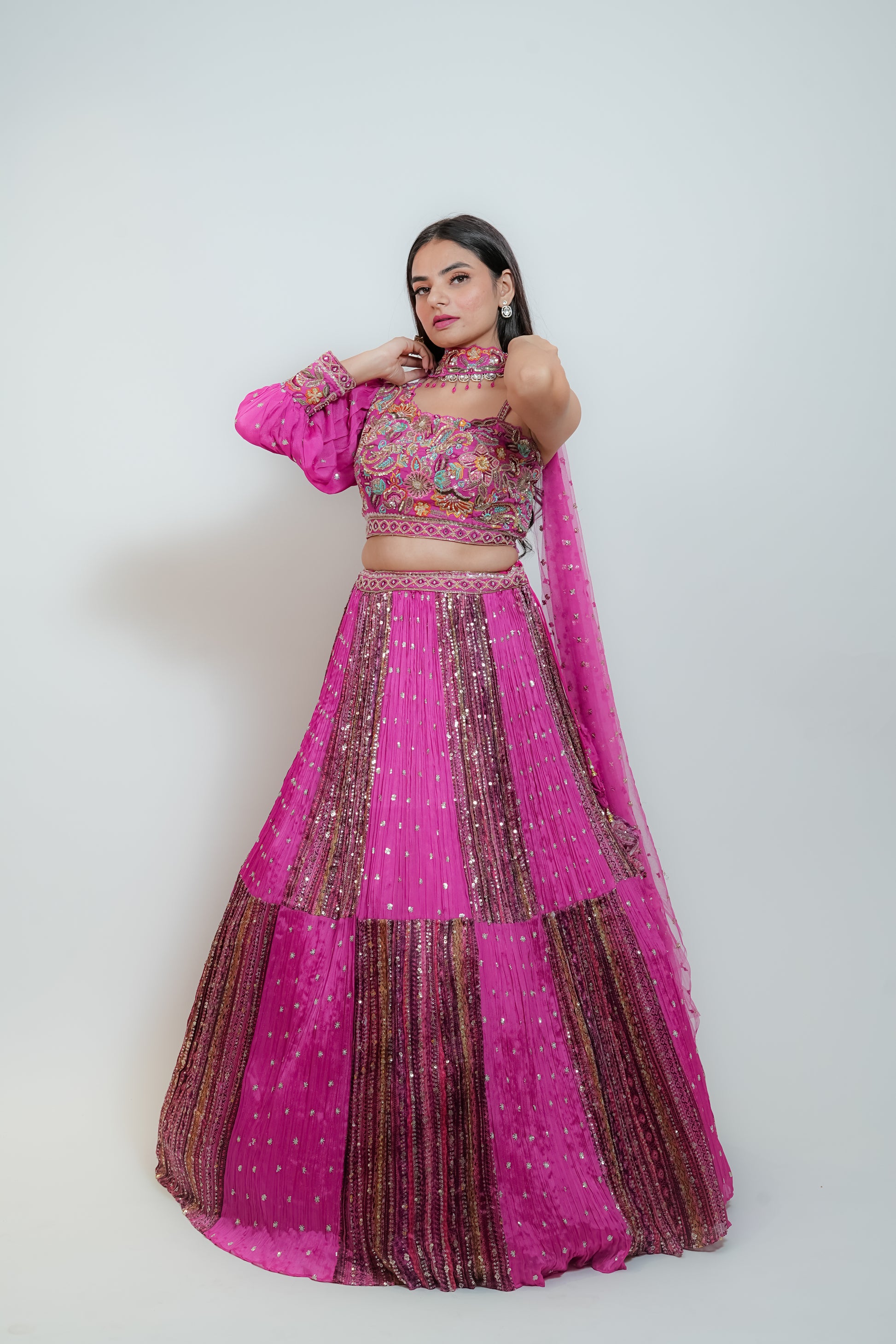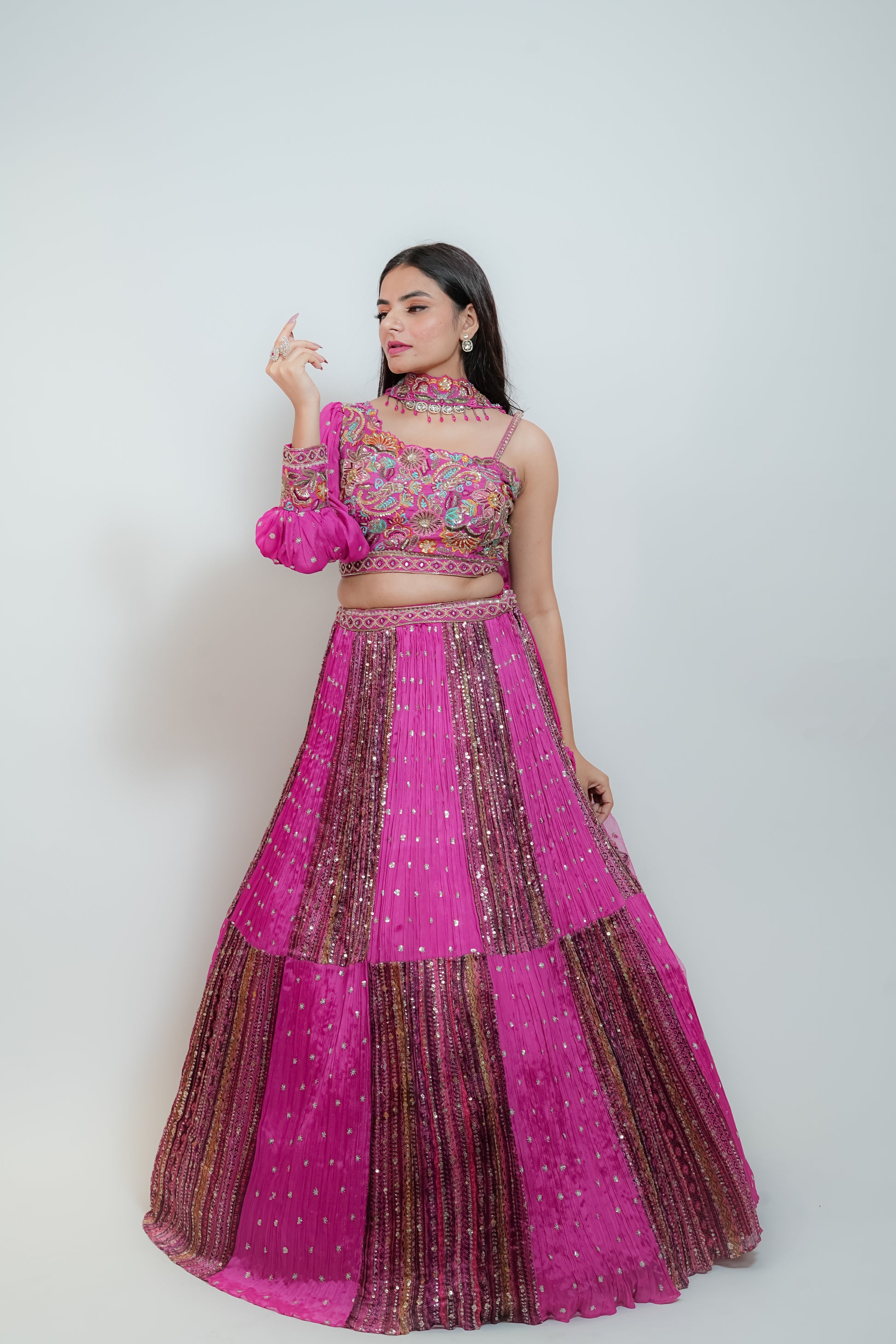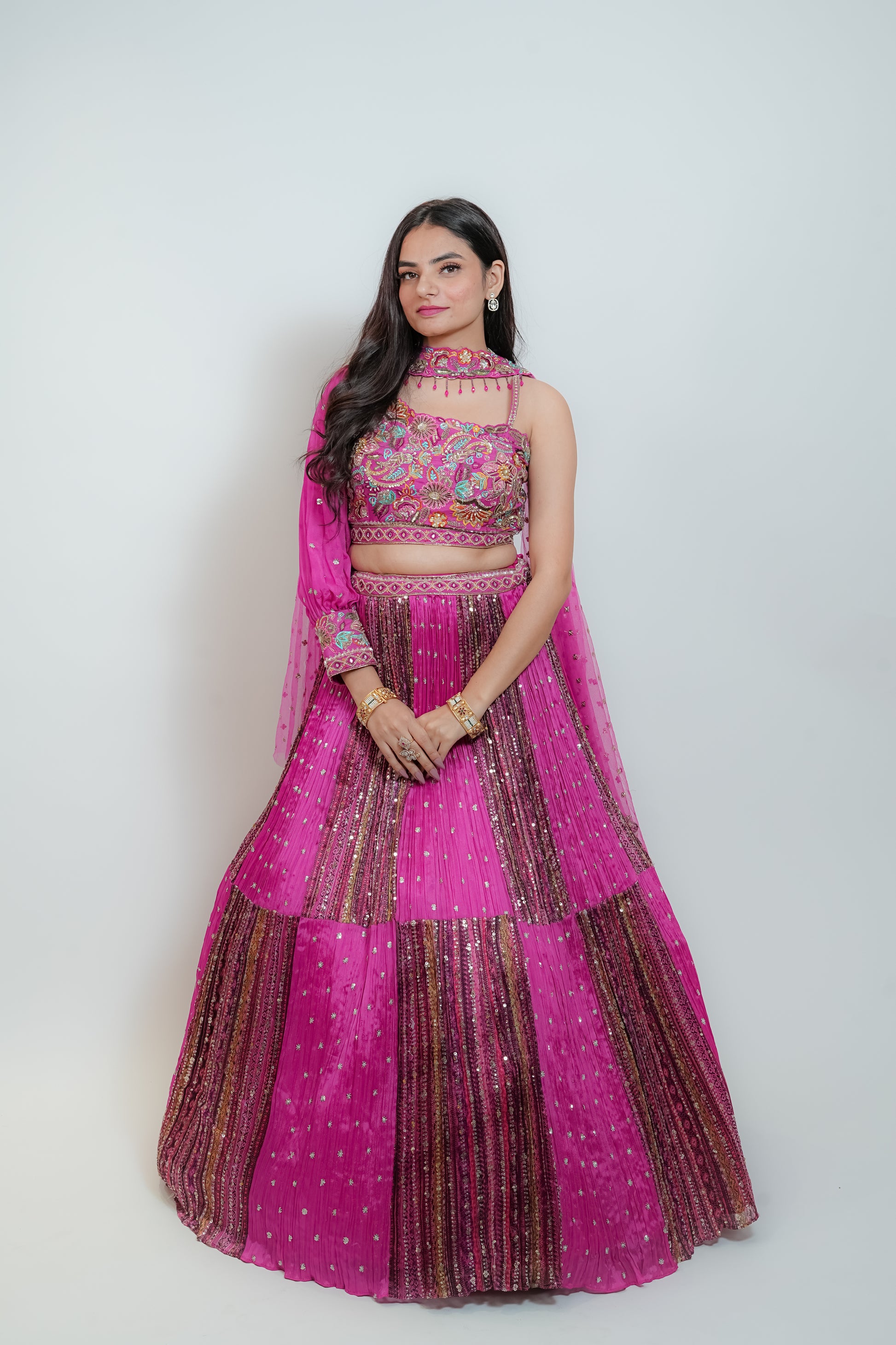 The one-sided sleeve blouse is made from silk fabric, intricately adorned with multicolored resham thread work, multicolored sequins, pearls, stones, cutdana, and mirror embellishments, all finished with elegant cutwork.