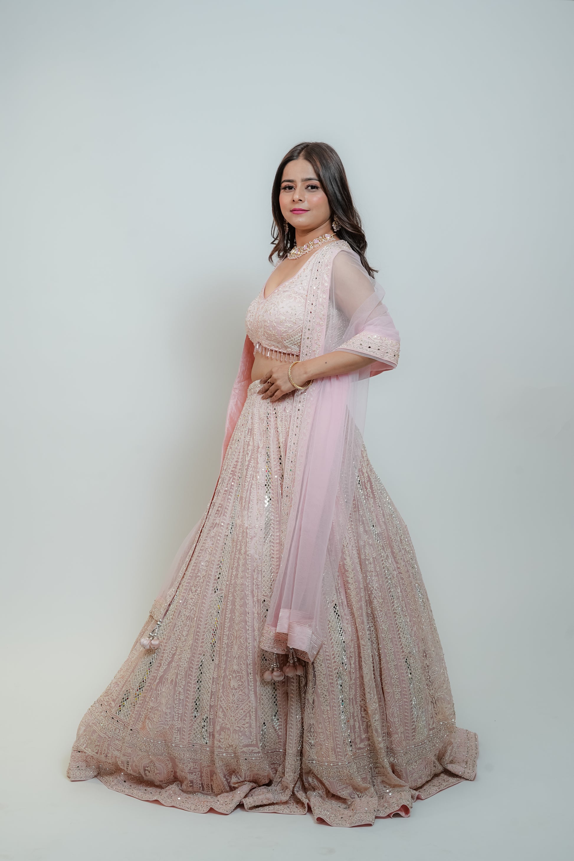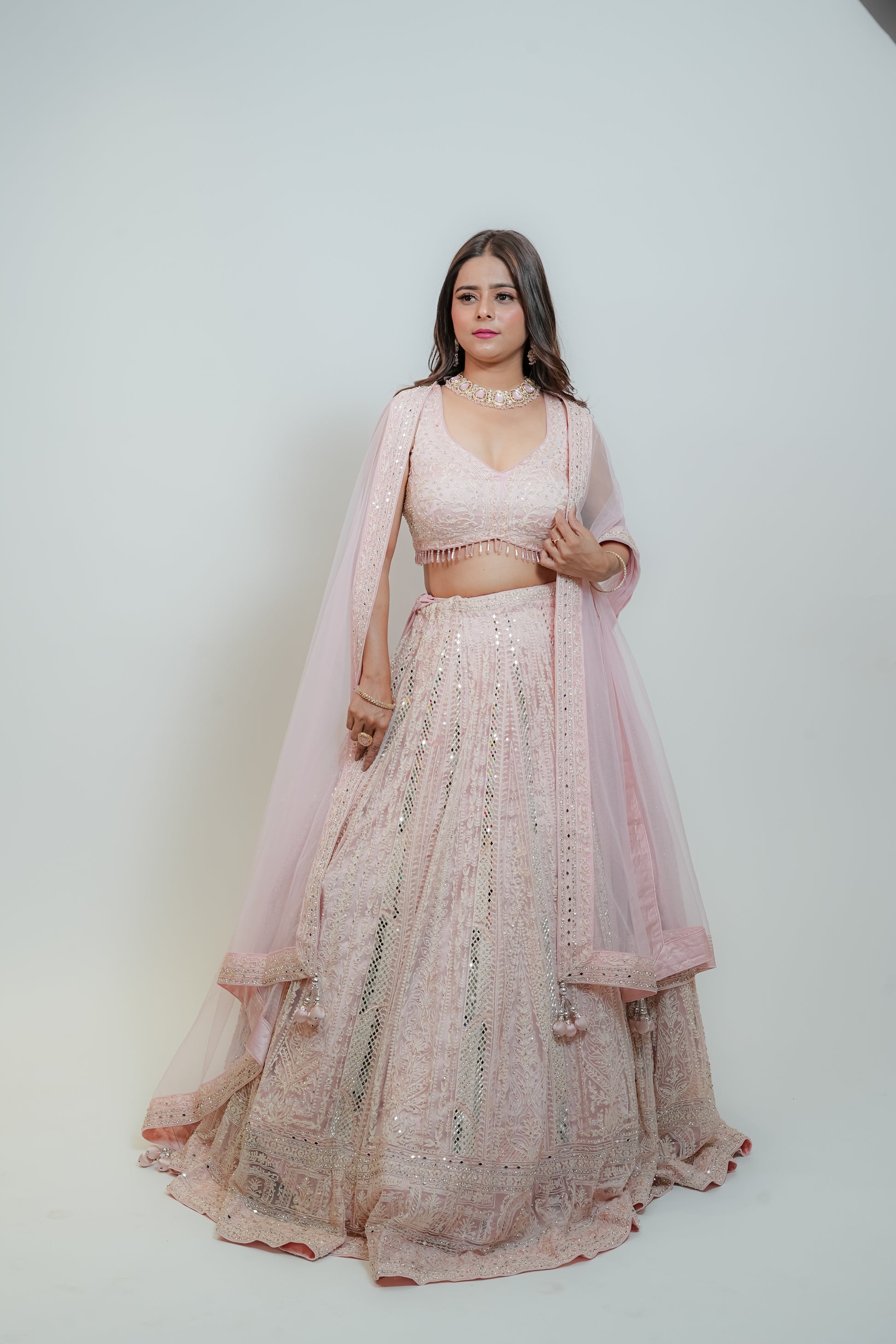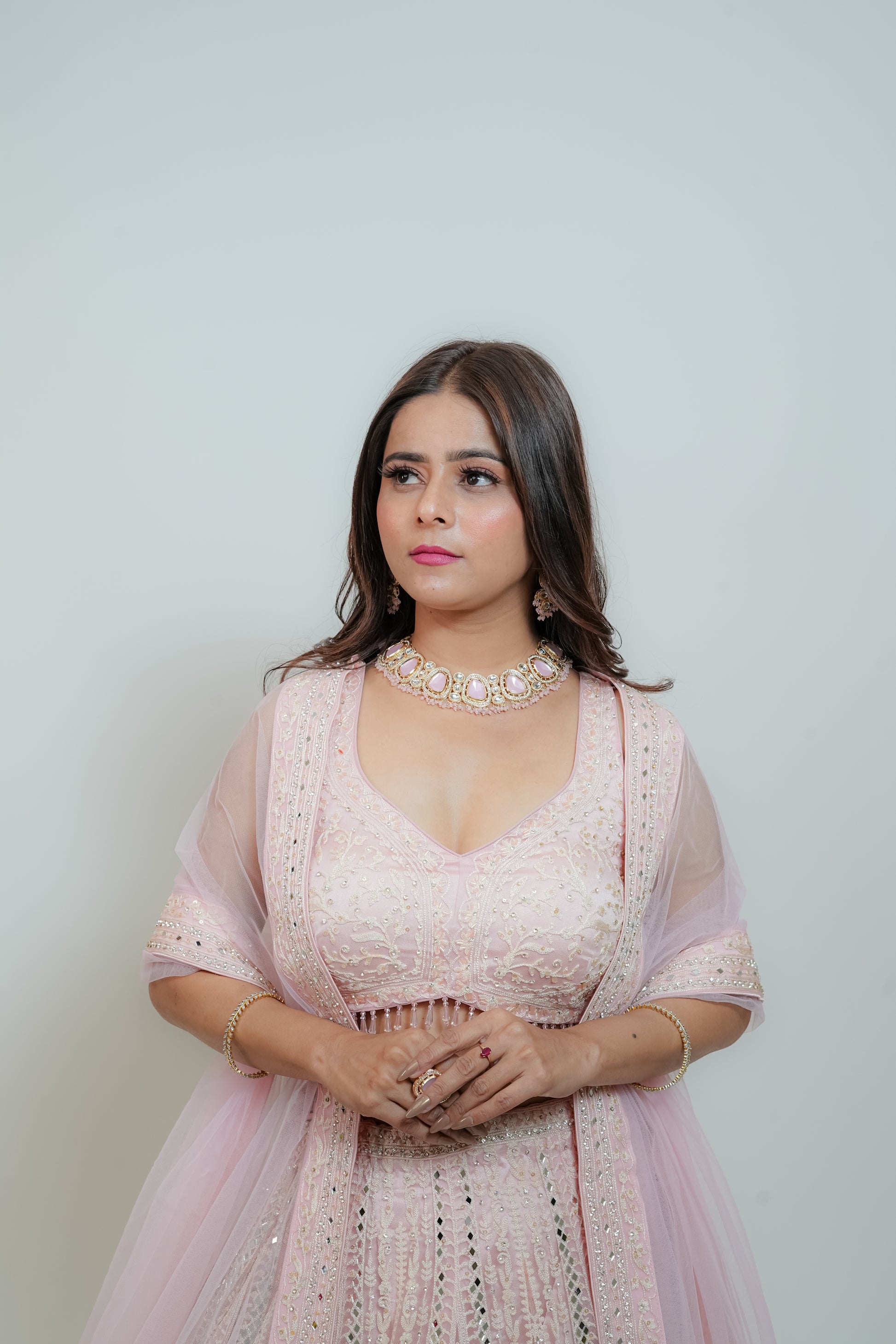 The skirt is made of net with thread work, mirror work, sequins, and stone embellishments. The blouse is also made of net and features thread work, sequins, stones, and cut dana. The waist of the blouse is adorned with crystal hangings.