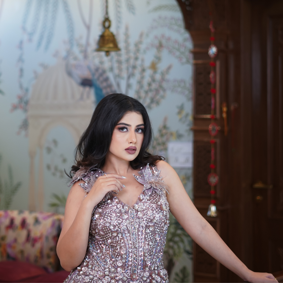 Our rose-pink Cinderella gown is all things magical—crafted with delicate hand embroidery and dreamy ruffles that swirl with every twirl. A perfect pick for making unforgettable entrances.