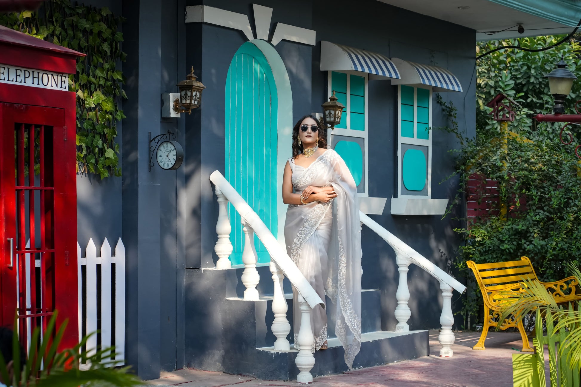 This saree is made from tissue fabric and features intricate work with cutdana, sequins, pearls, and stones.