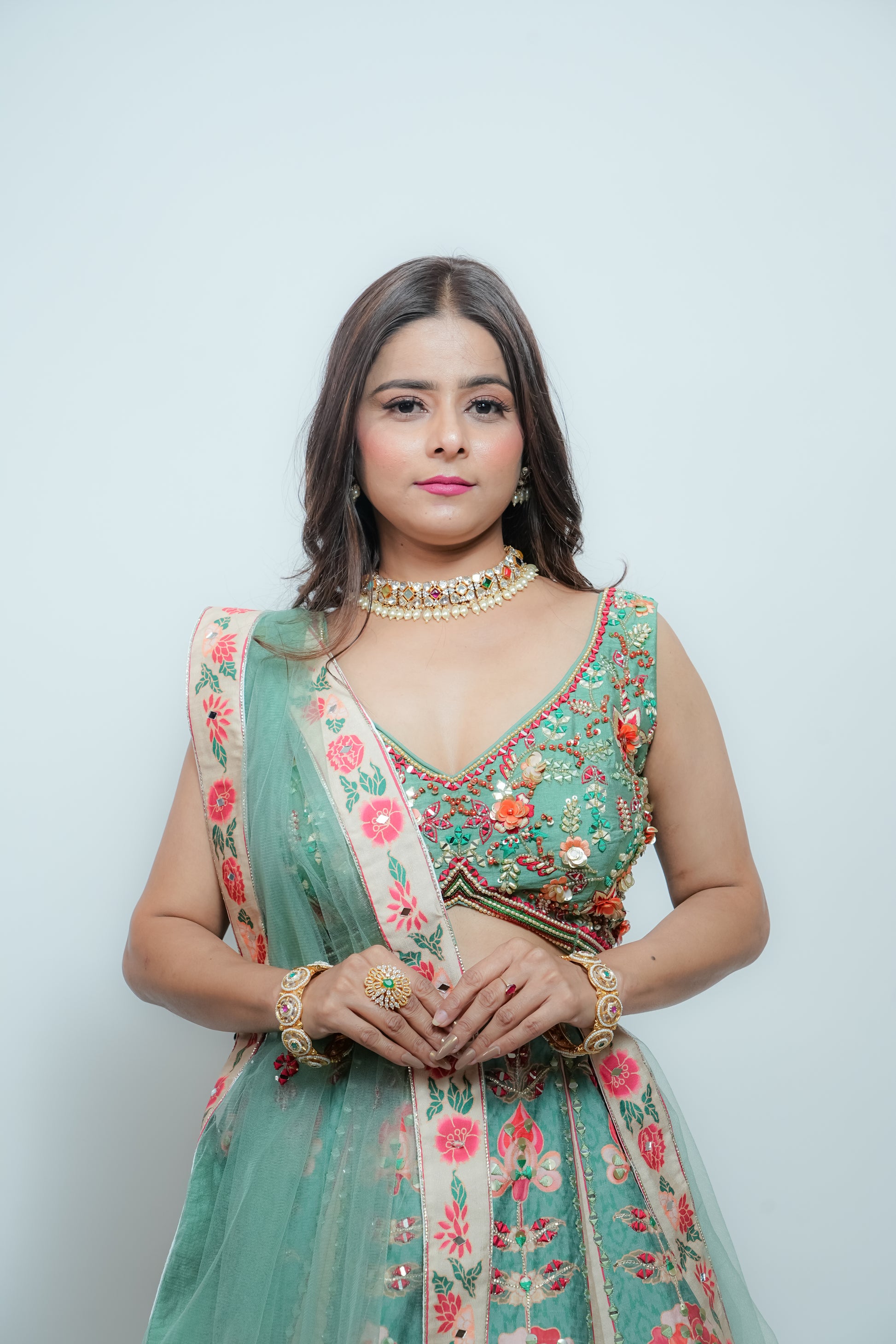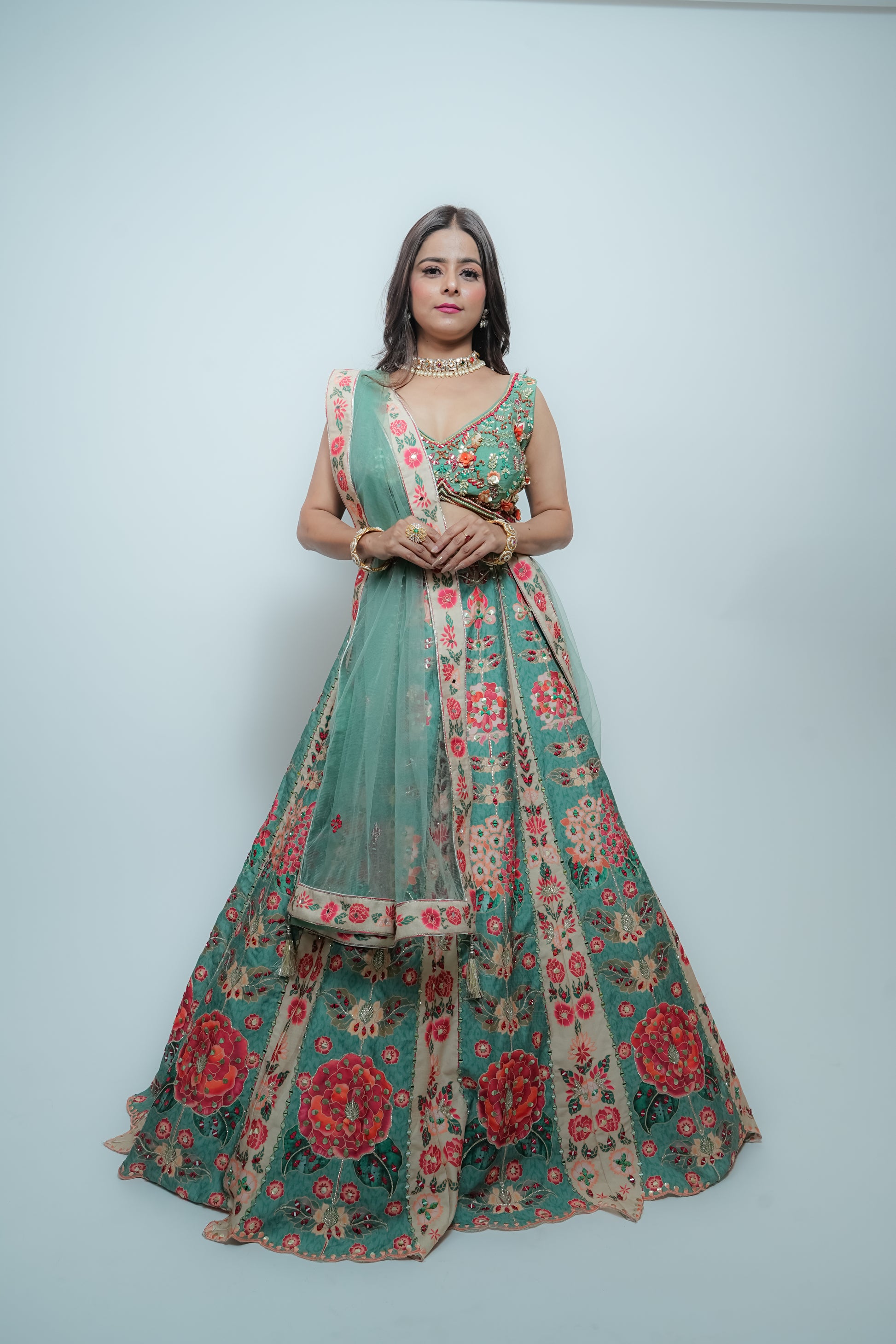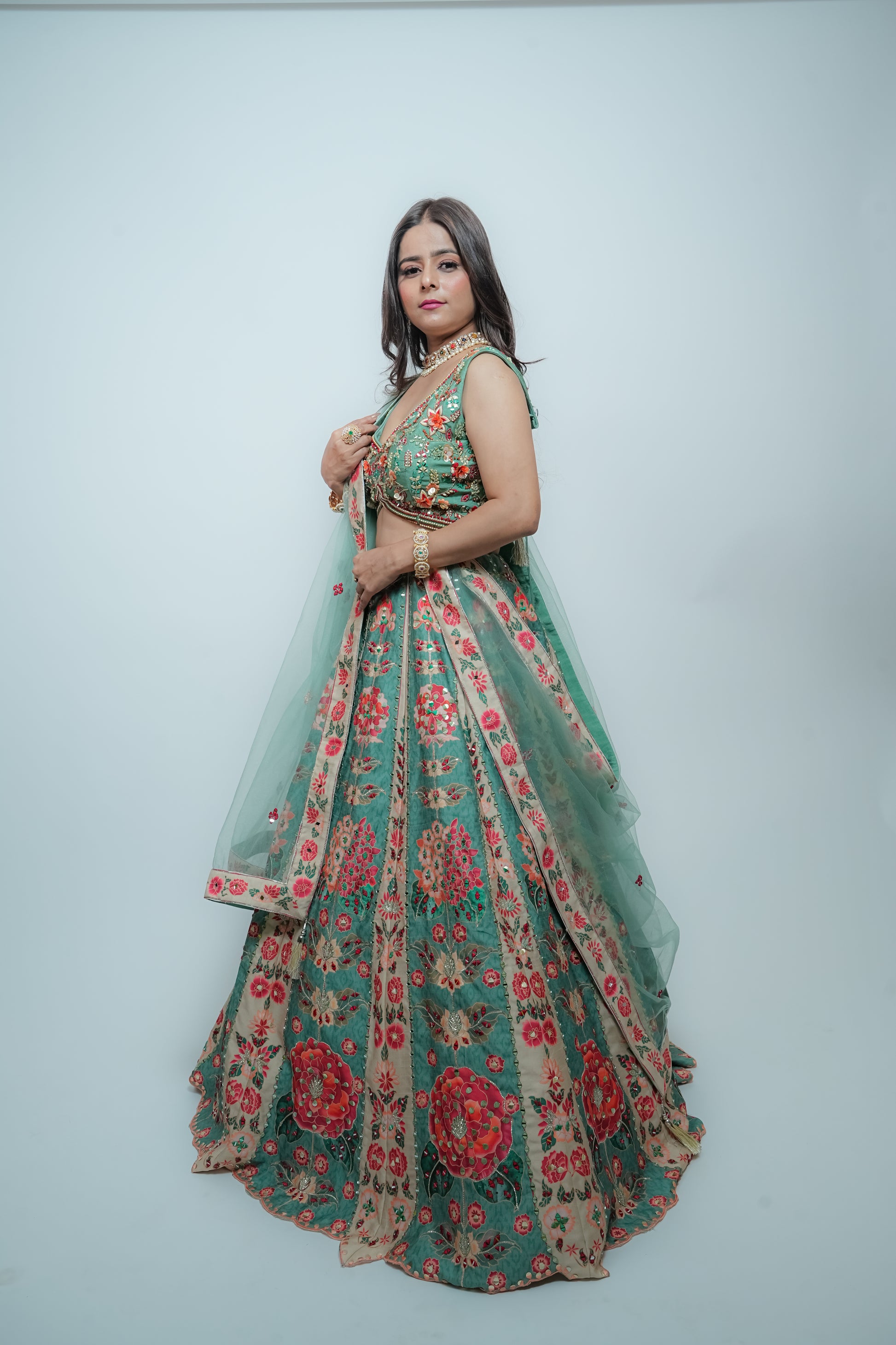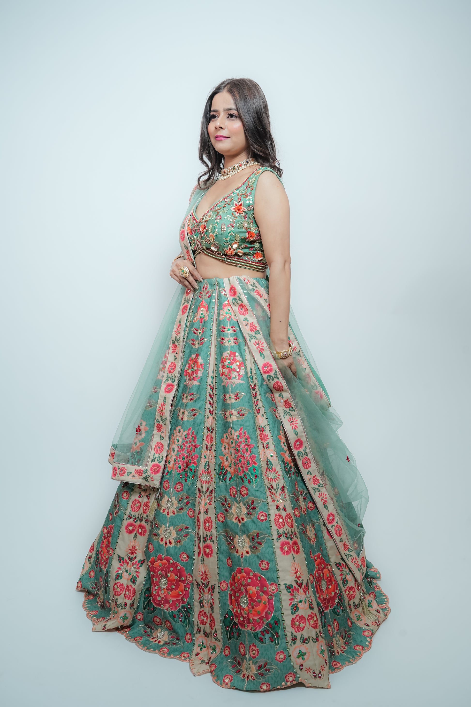 The skirt is made of dupion silk with a full multicolor print, featuring intricate mirror, sequin, silk, and gota work. The blouse is also made of dupion silk and embellished with cut dana, pearls, sequins, silk thread, and mirror work. The dupatta is made of net and has scattered mirror and silk detailing. All four borders of the dupatta are finished with printed dupion silk fabric, highlighted with mirror work.