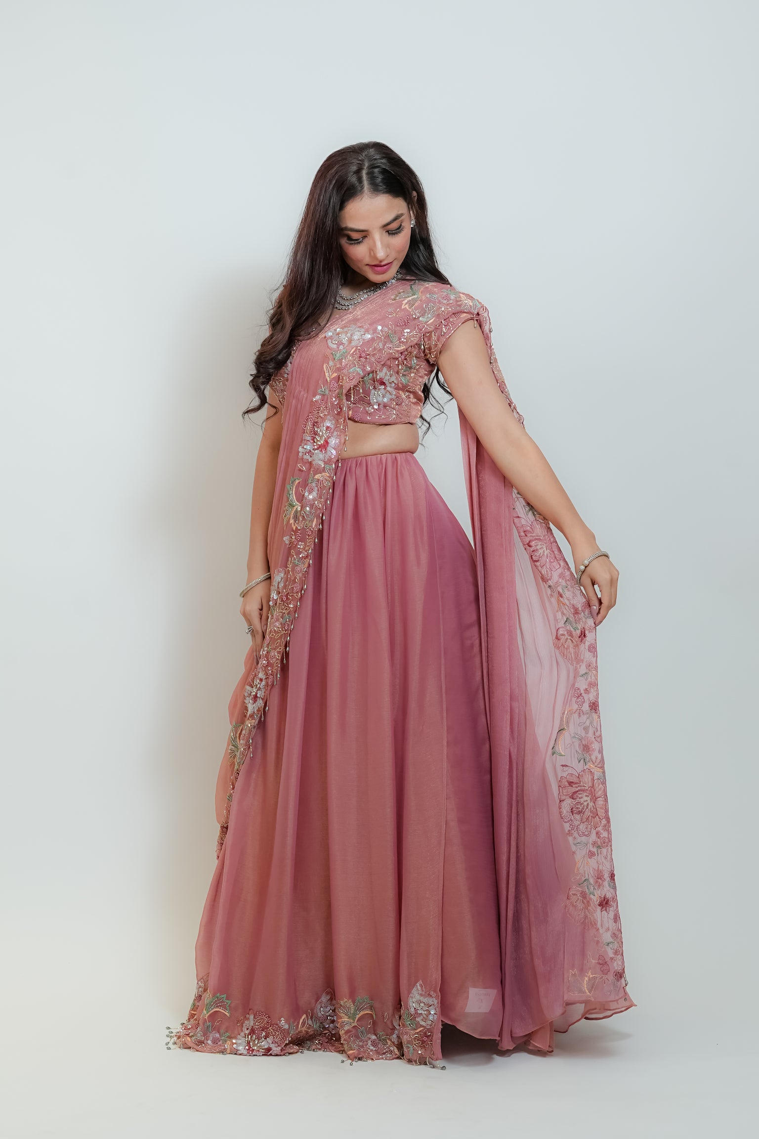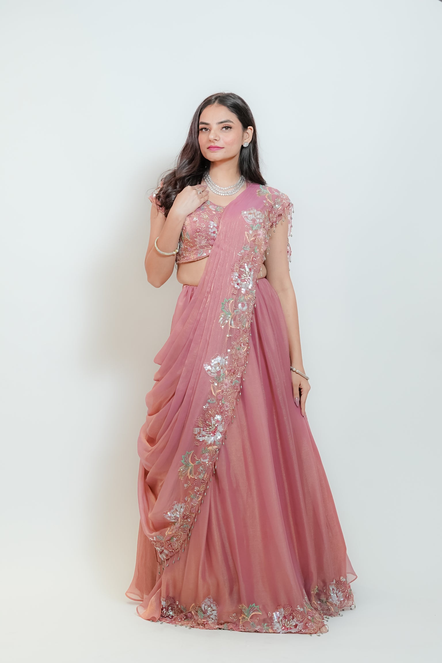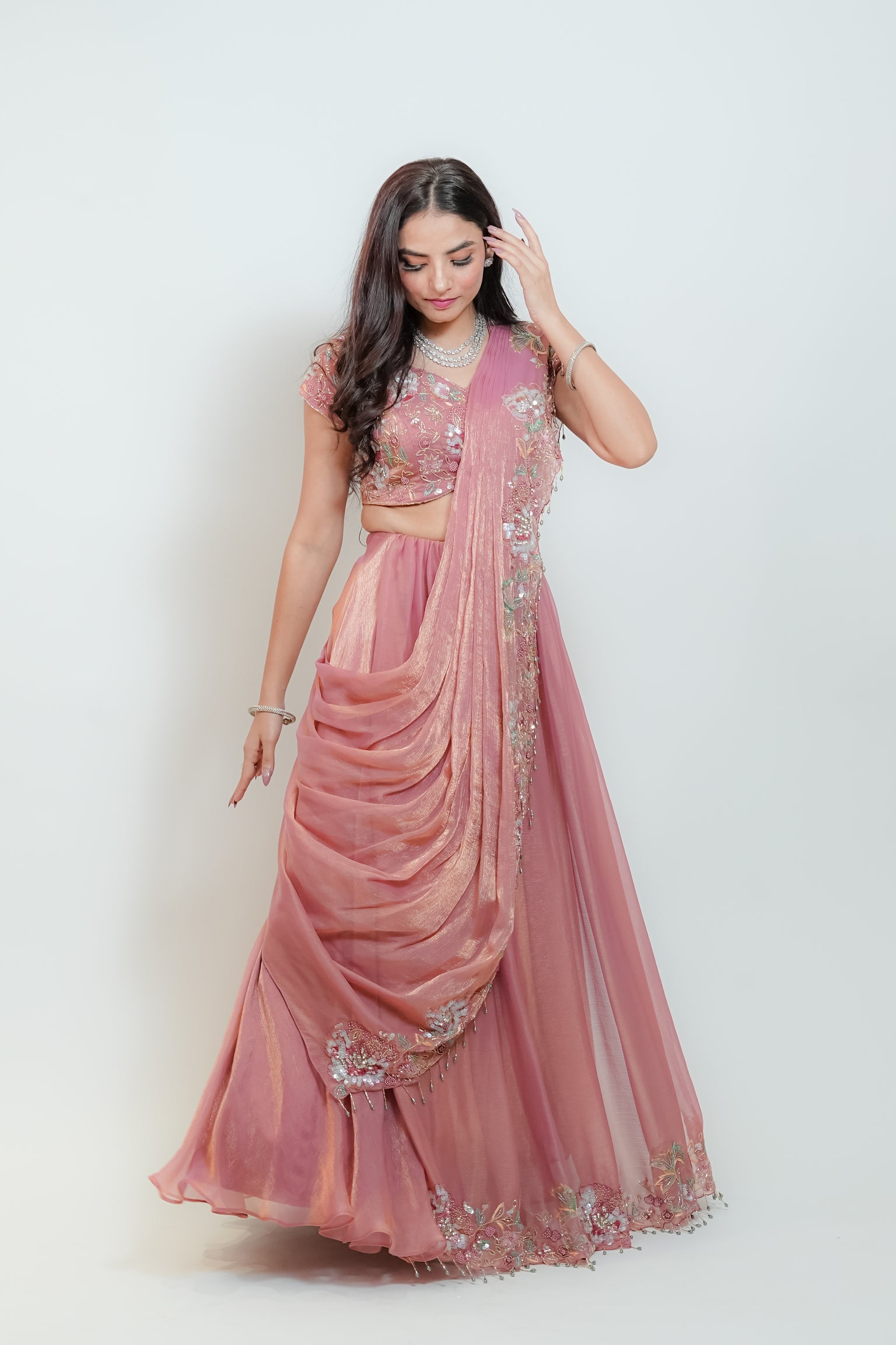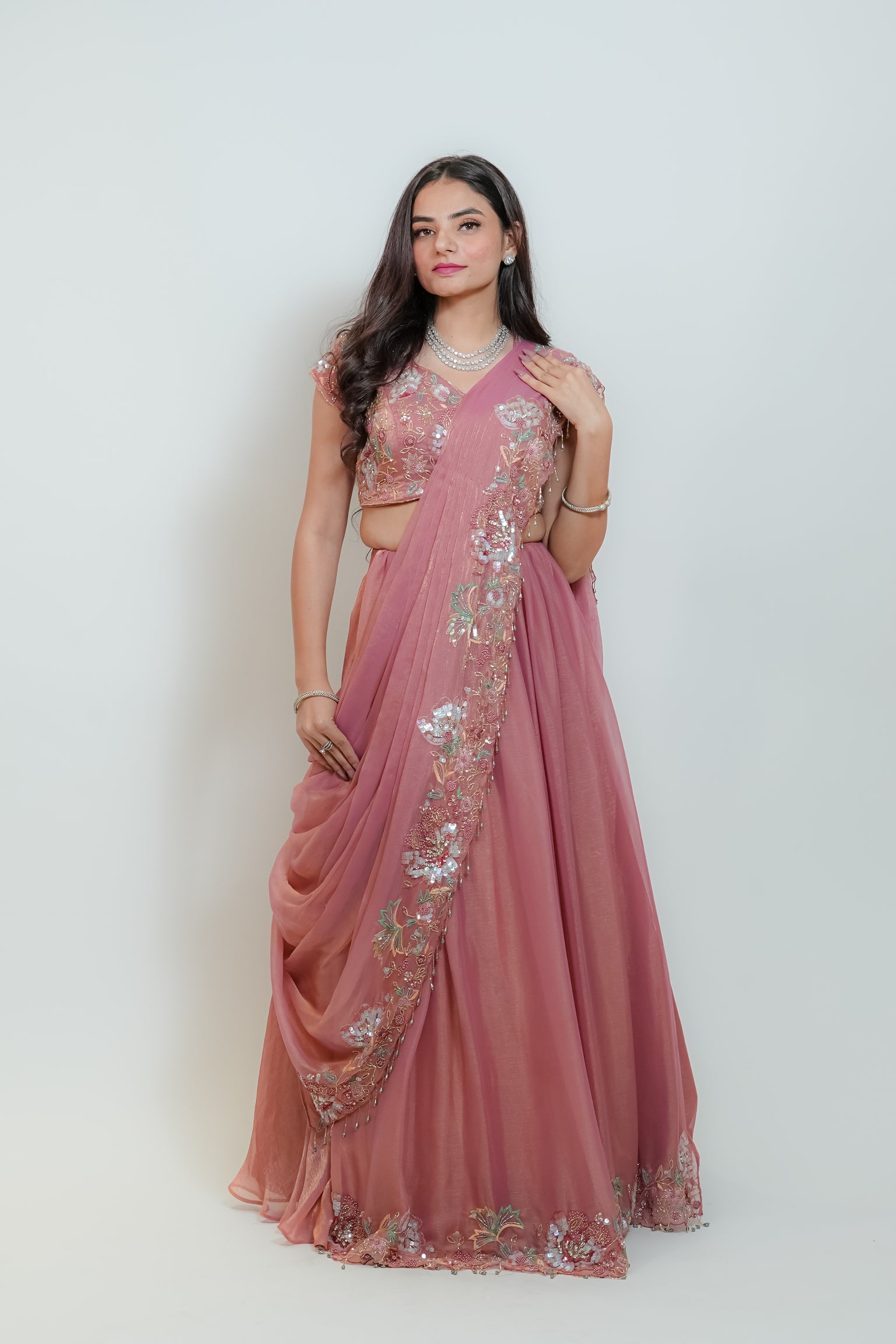 The skirt is made of shimmer tissue fabric and comes with an attached draped dupatta. The drape features multicolored sequin work, multicolored resham embroidery, pearls, stones, and cutdana embellishments, with elegant side cutwork and pearl hangings. The blouse is also crafted from shimmer tissue fabric, adorned with multicolored sequins, pearls, cutdana, stones, and resham thread work. Additionally, the set includes a separate belt embellished with cutdana, pearls, multicolored resham, multicolored sequins, and pearl hangings, perfectly complementing the ensemble in a soft onion pink shade.