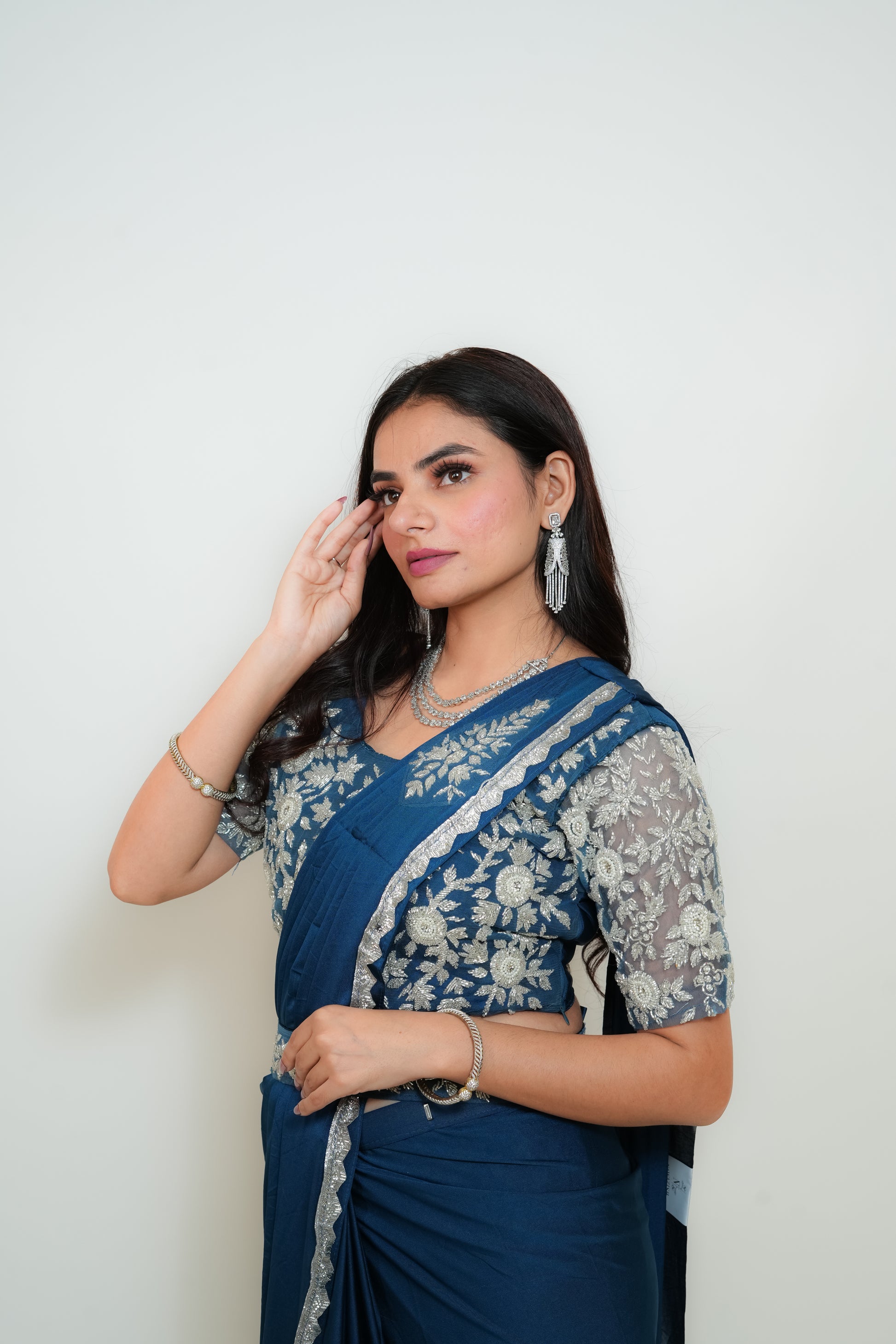 This is a drape saree made of lycra fabric. All borders are finished with silver glitter lace, embellished with cutdana and stone work. A patch with cutdana and pearl work is placed on the shoulder area of the drape. The blouse is made of net fabric and features cutdana, pearl, and stone embroidery. A belt is included, adorned with cutdana work.
